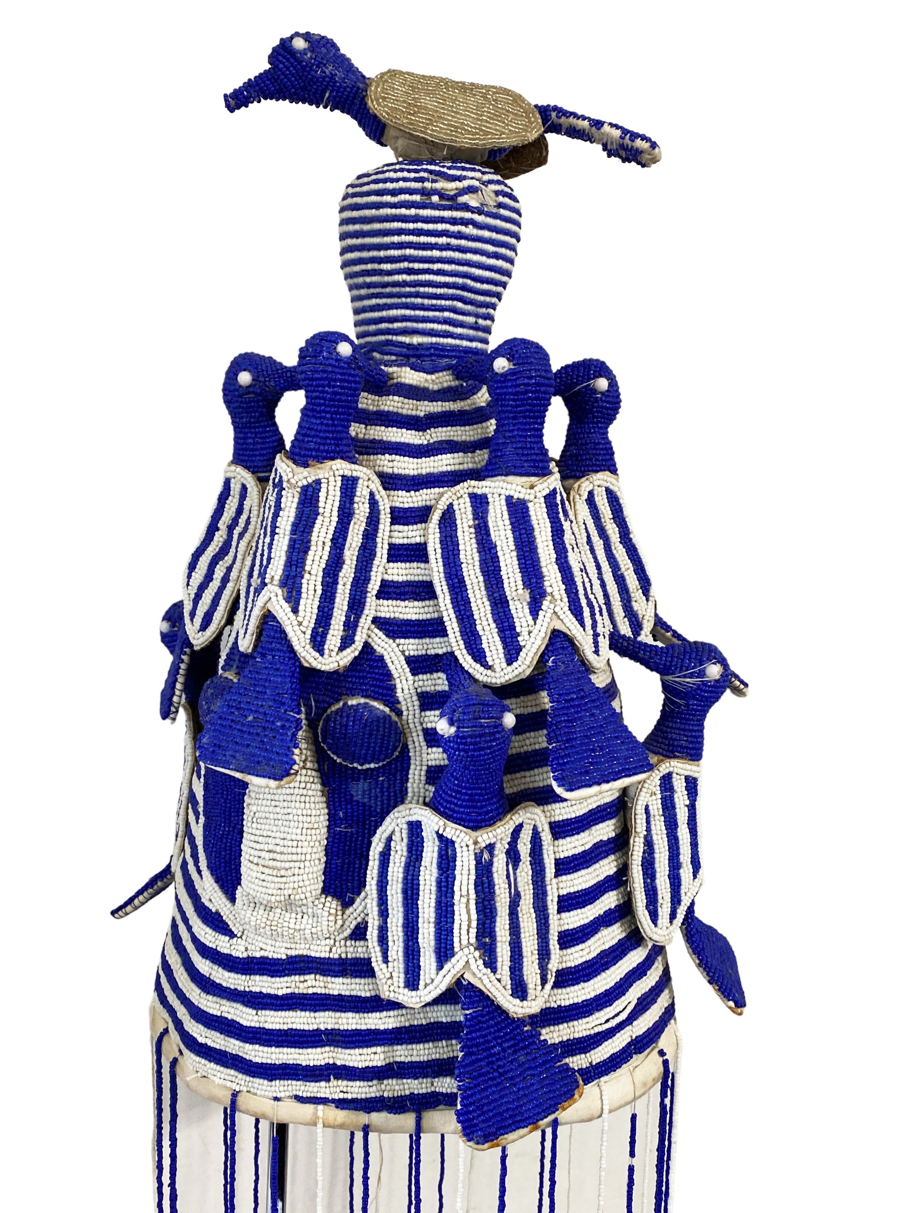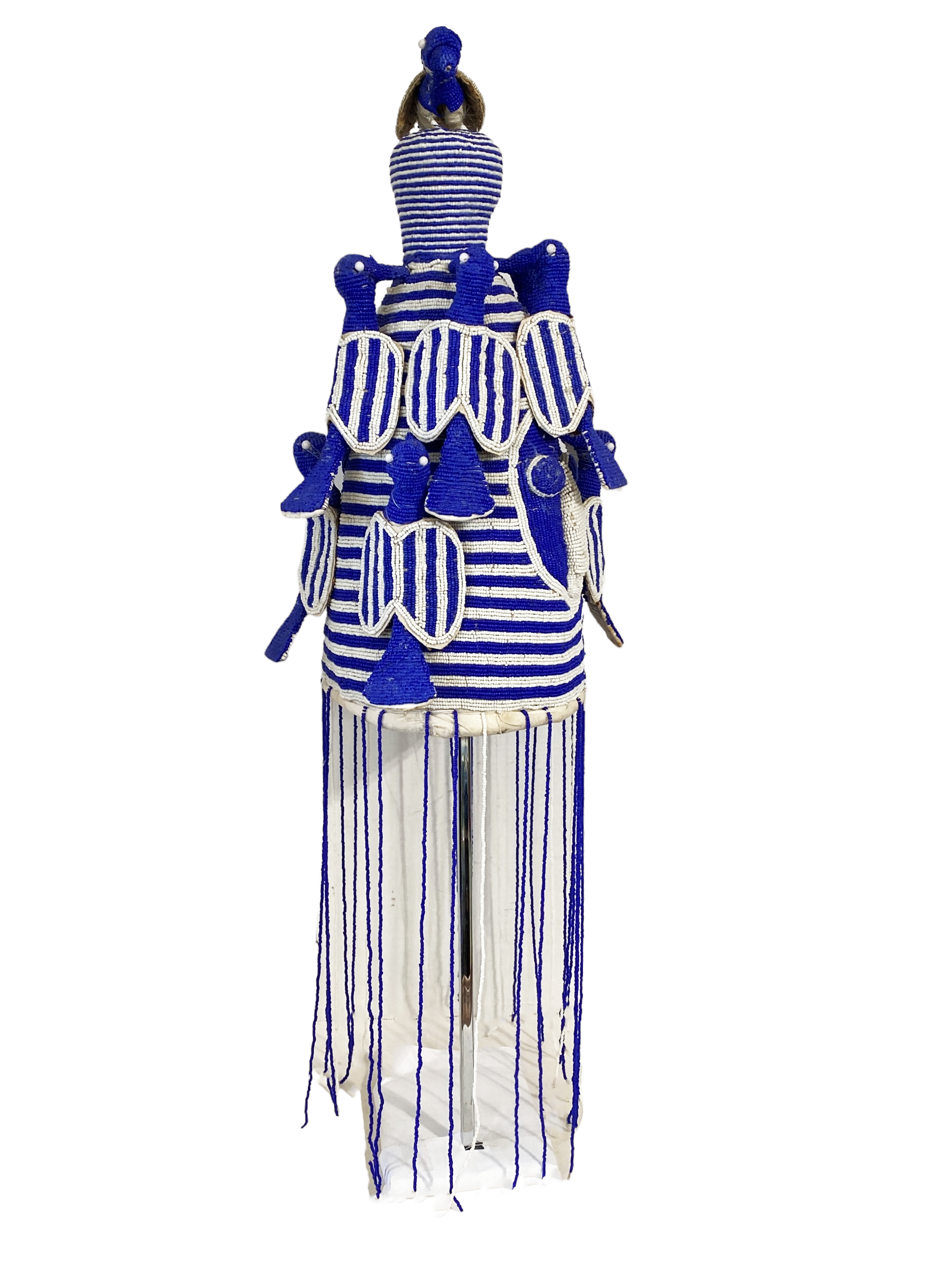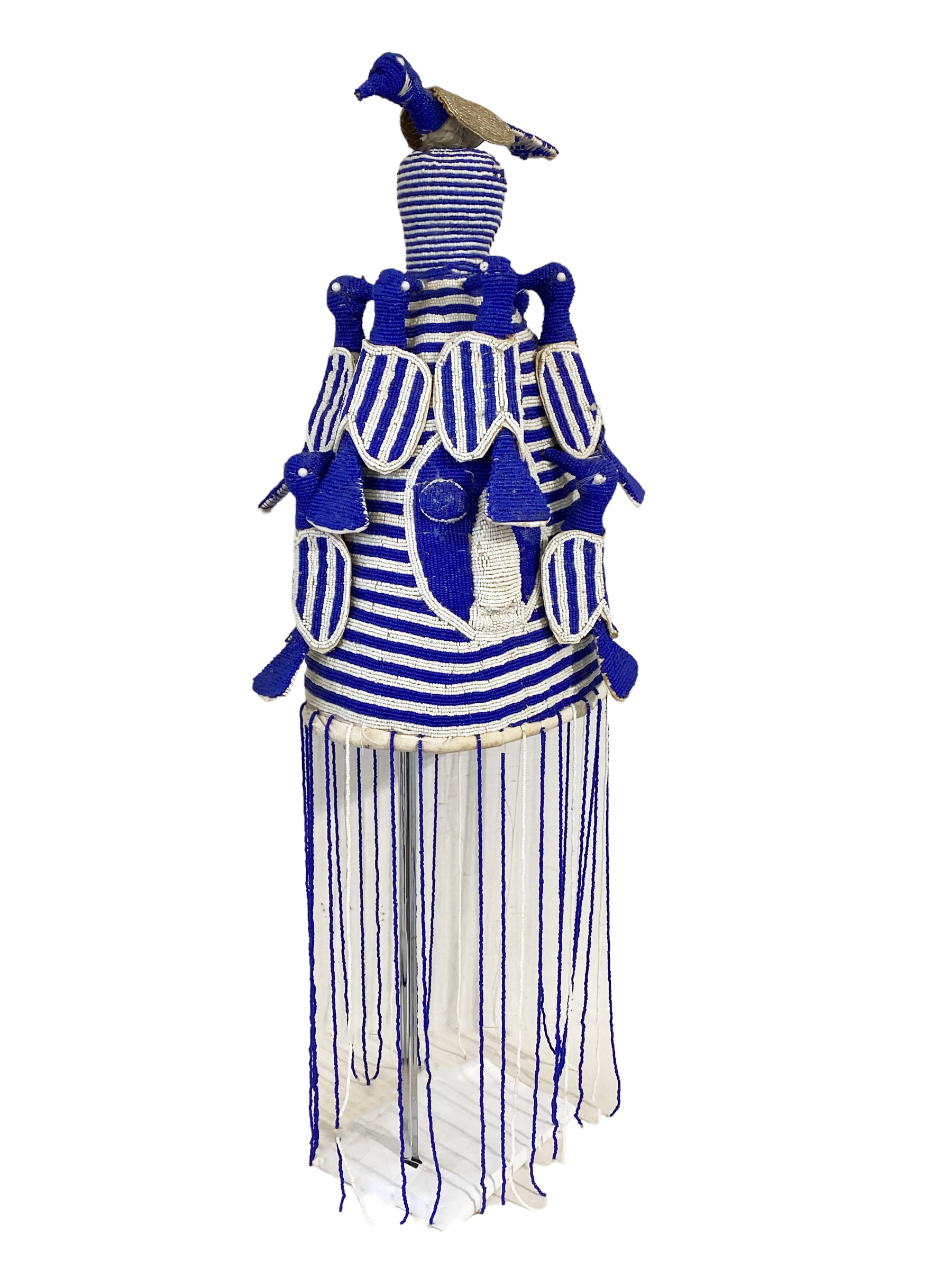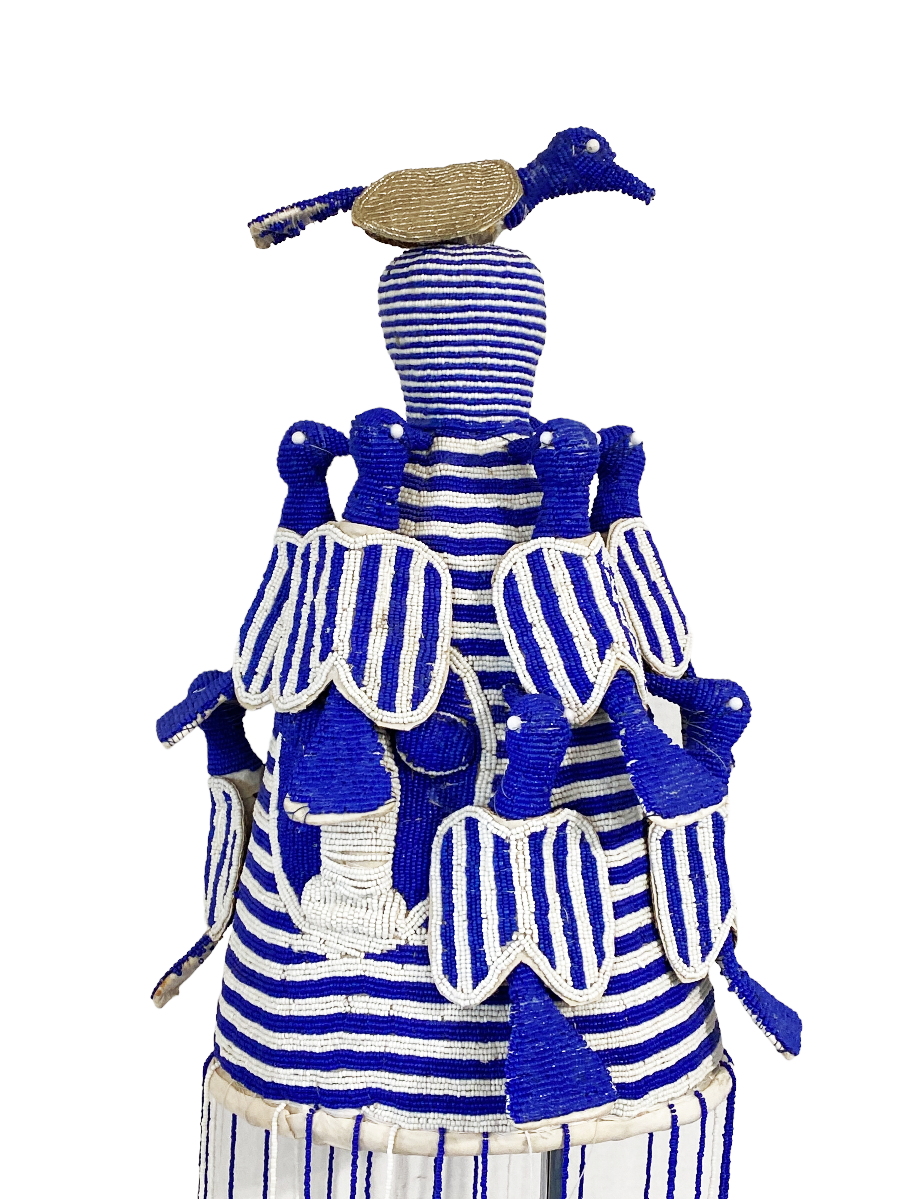 This exquisite African Yoruba King beaded crown from Nigeria is adorned with blue and white beads and intricately decorated with beaded birds. The birds symbolize áshe (ah-SHE), a divine force believed to have the power to manifest one's desires. The use of glass beads in the crown represents royalty, while each bead color is associated with a different Yoruba deity. The veil serves to conceal the king's face, emphasizing the importance of the crown as the true source of power. This 18" H crown (32"H with long beads) measures 8" D in diameter and may have minor bead loss, adding to its vintage charm.( stand is not included in the sale )