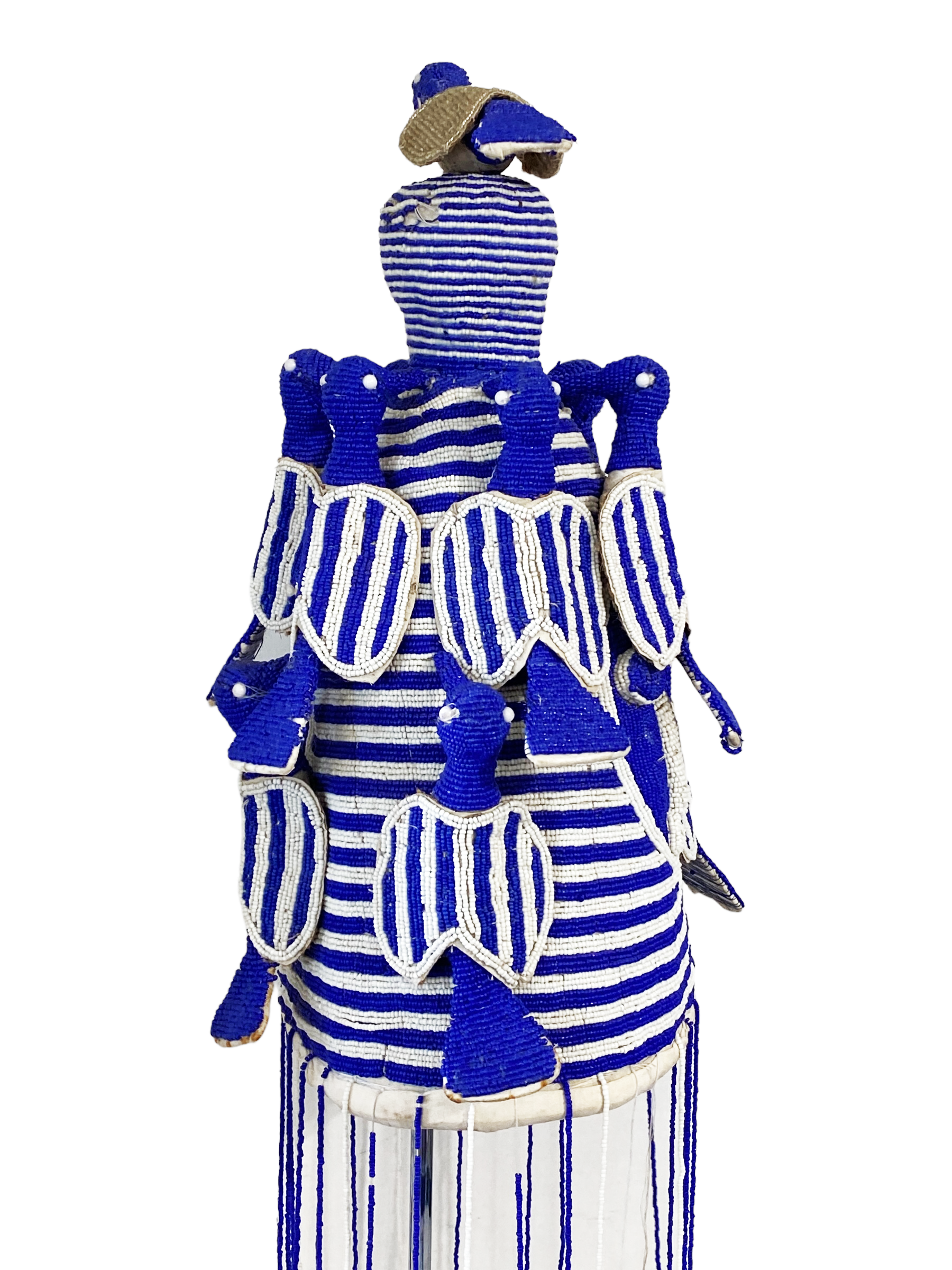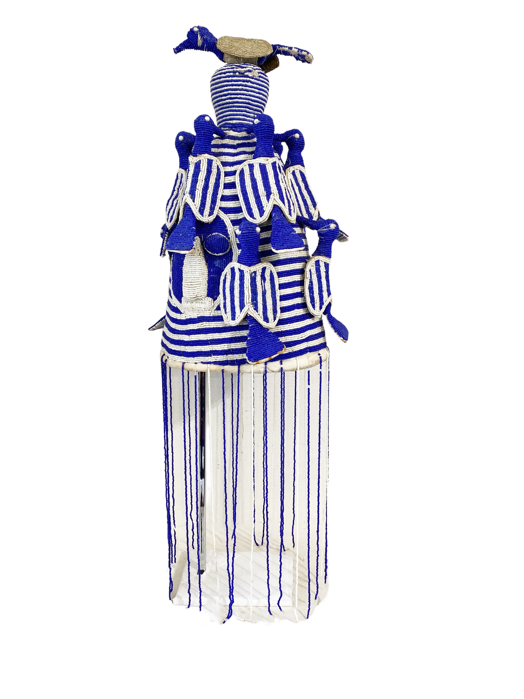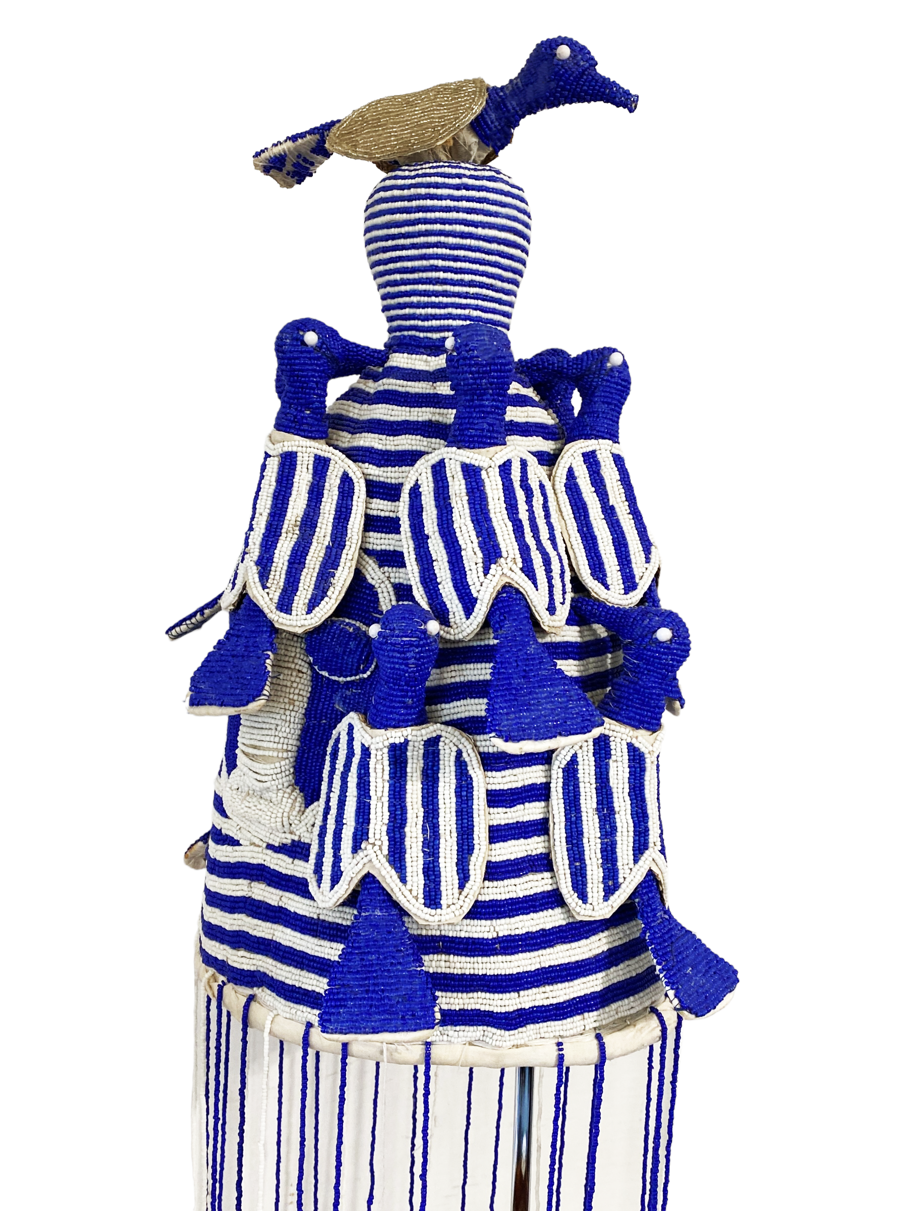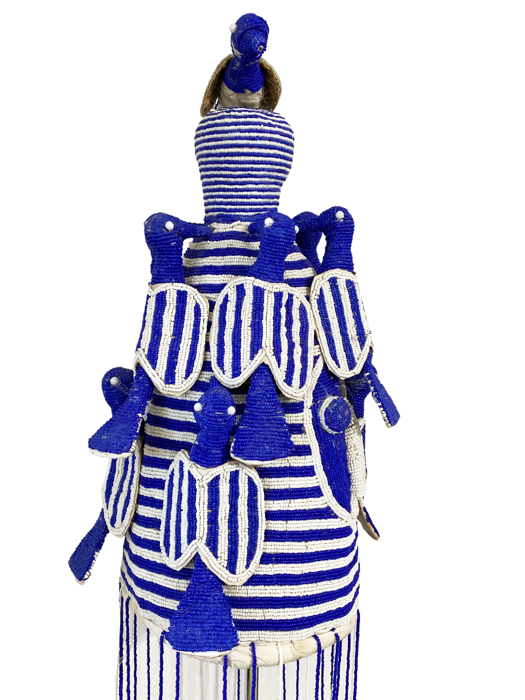 This exquisite African Yoruba King beaded crown from Nigeria is adorned with blue and white beads and intricately decorated with beaded birds. The birds symbolize áshe (ah-SHE), a divine force believed to have the power to manifest one's desires. The use of glass beads in the crown represents royalty, while each bead color is associated with a different Yoruba deity. The veil serves to conceal the king's face, emphasizing the importance of the crown as the true source of power. This 18" H crown (32"H with long beads) measures 8" D in diameter and may have minor bead loss, adding to its vintage charm.( stand is not included in the sale )
