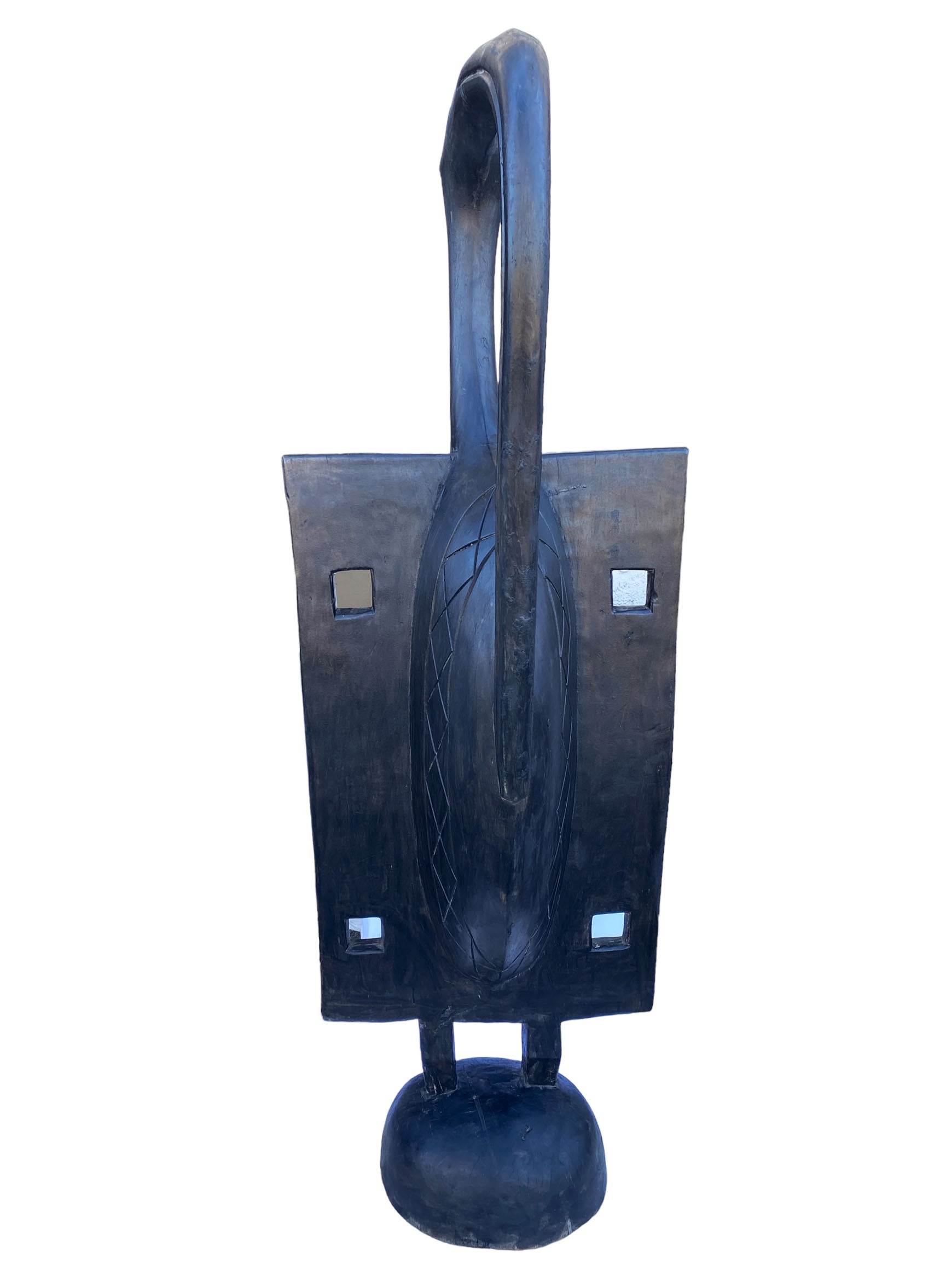 This magnificent sculpture features a majestic Senufo Bird (Hornbill), with wings open and hand-crafted from a single piece of wood. The Hornbill is a revered creature, known for its lifelong devotion to its mate and equal participation in raising their young. Represented in its erect and protective stance, the Hornbill is a symbol of fertility and the ancestral roots of the Senufo people. Originally worn during long dances and processions, this 76" h by 26" w by 25" d figure exudes a sense of awe and reverence.