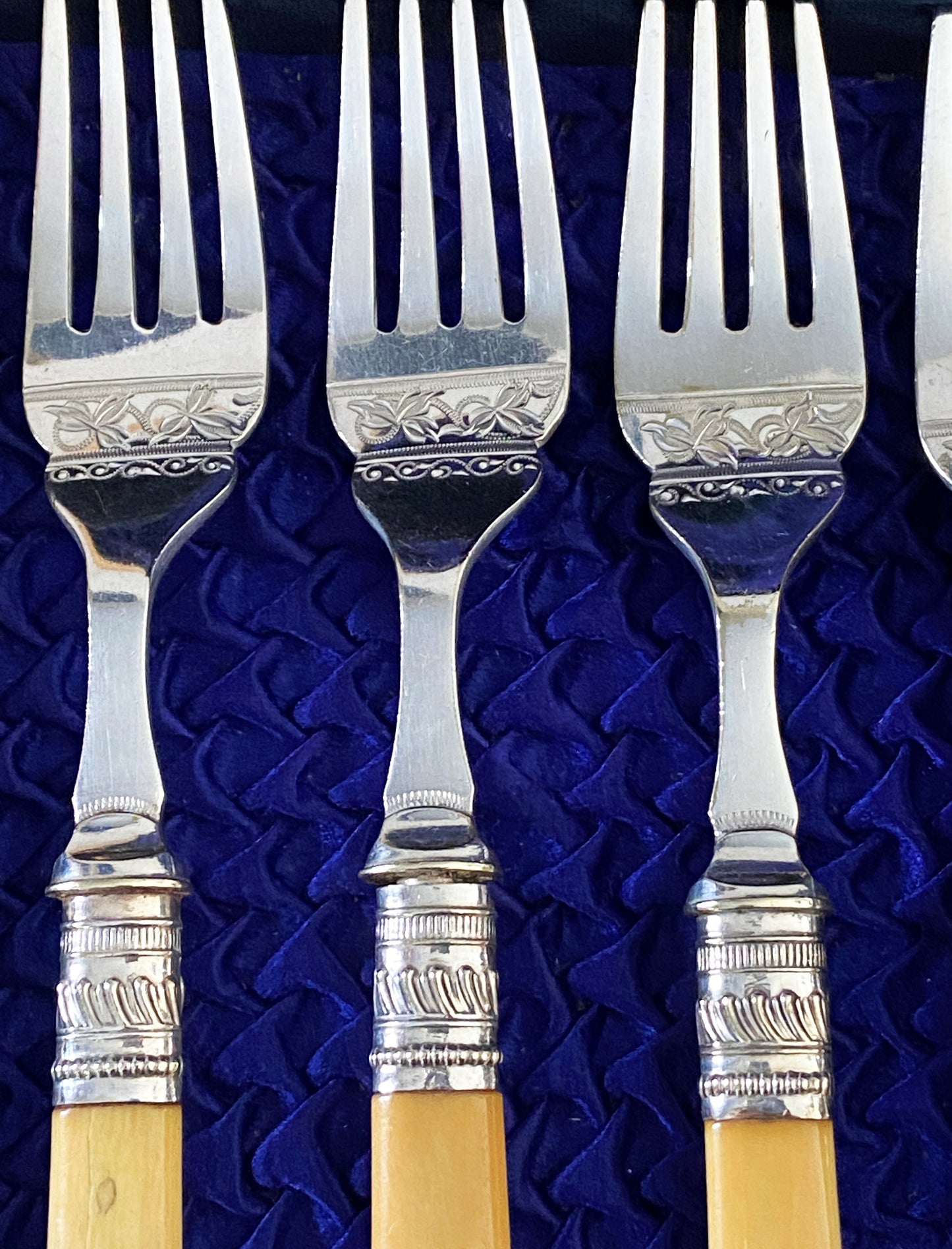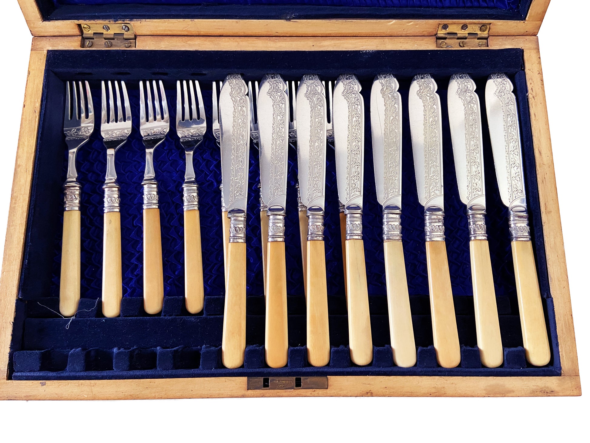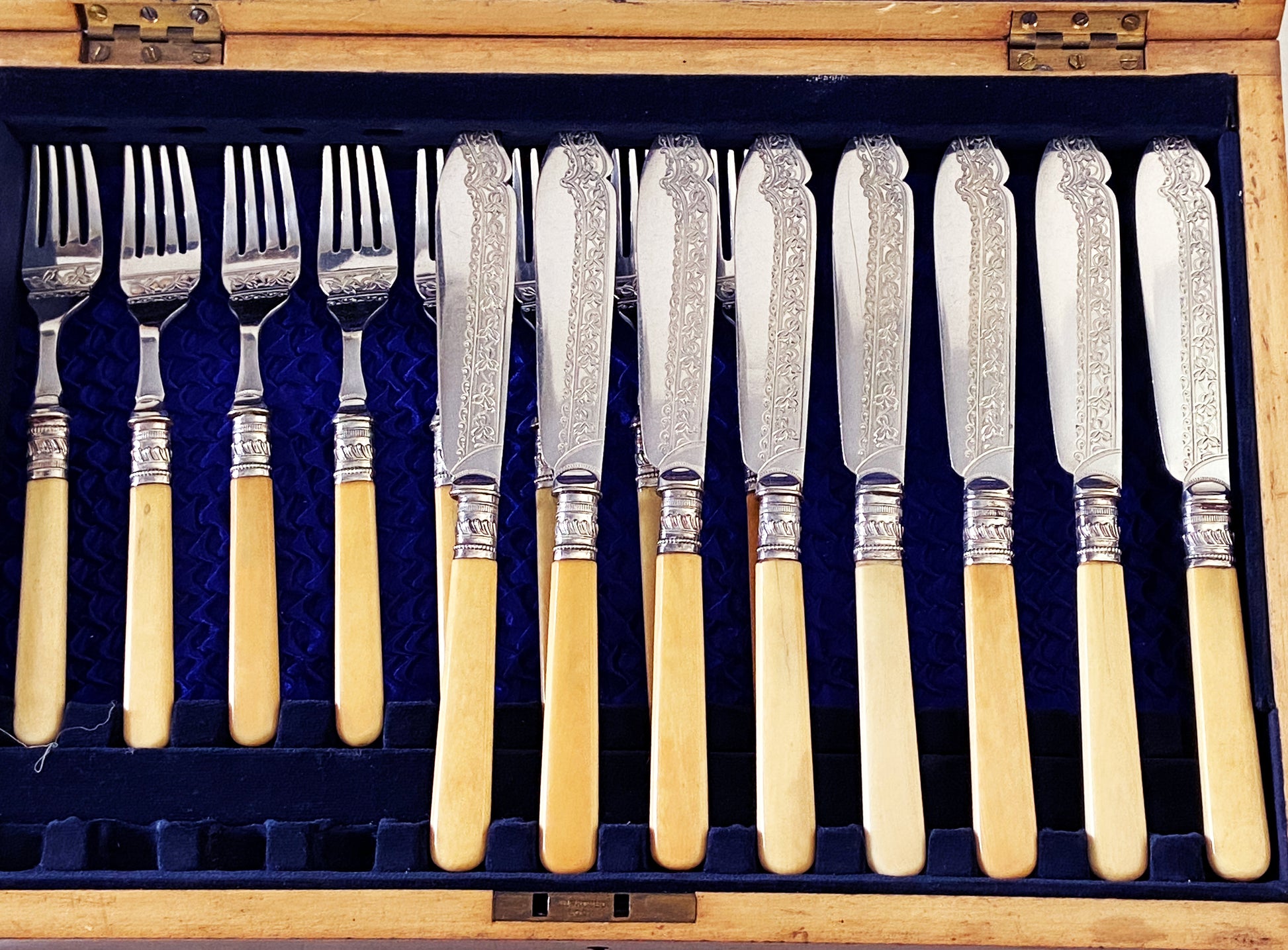 Elegant Place Setting For 8 English Sheffield Engraved Fish Knives And Forks In Box. Made By Joseph Elliot & Sons c.1878-1972 , , Dimensions; Knives Are 8.75"L by 1" w ,forks 7.5"h by 1" w.