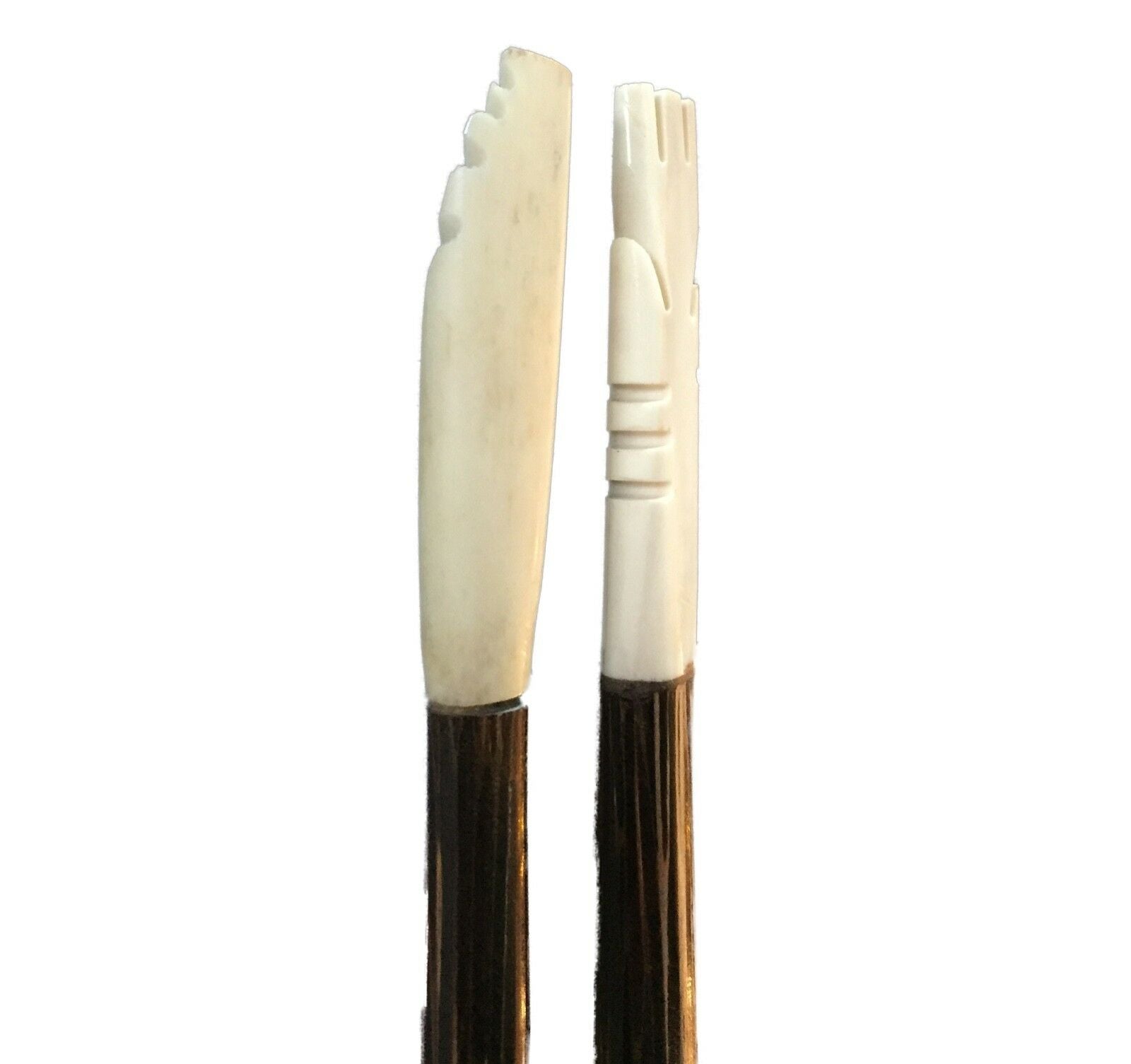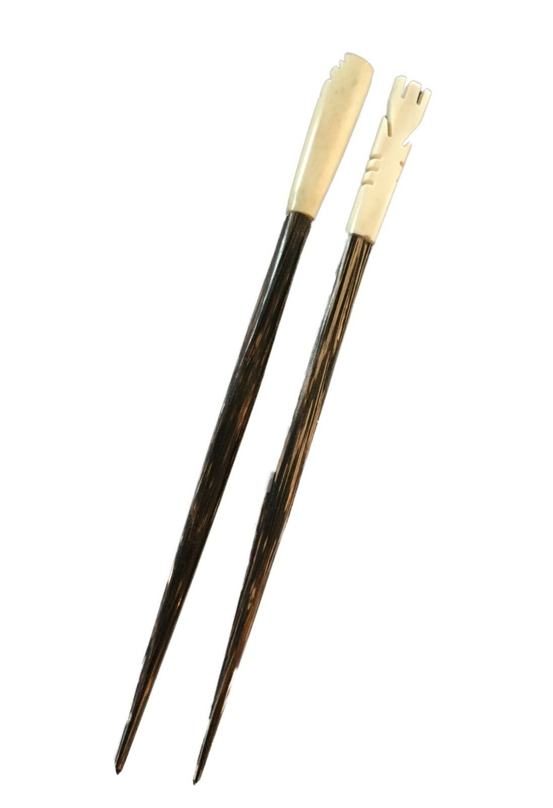 Very unusual delicate slender set of two ethnic hair pins of coconut wood and bone .