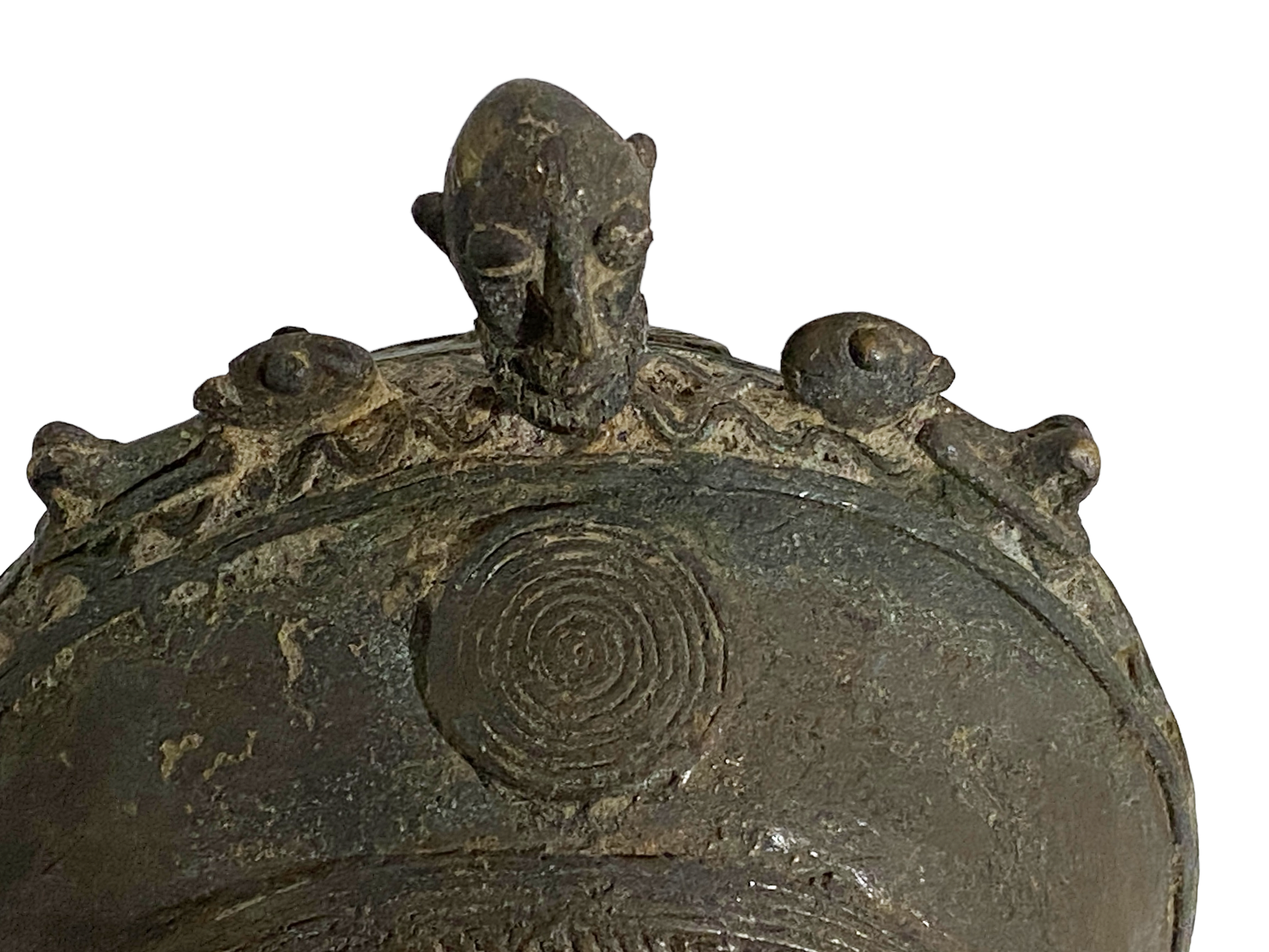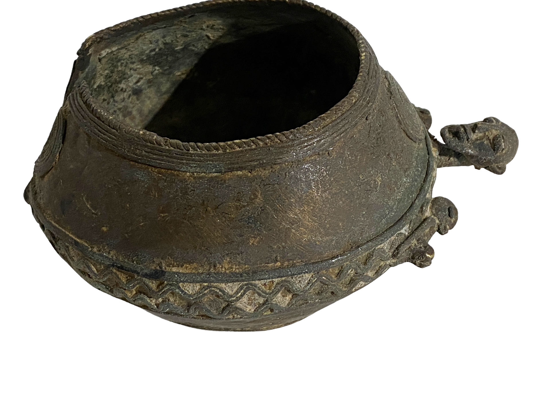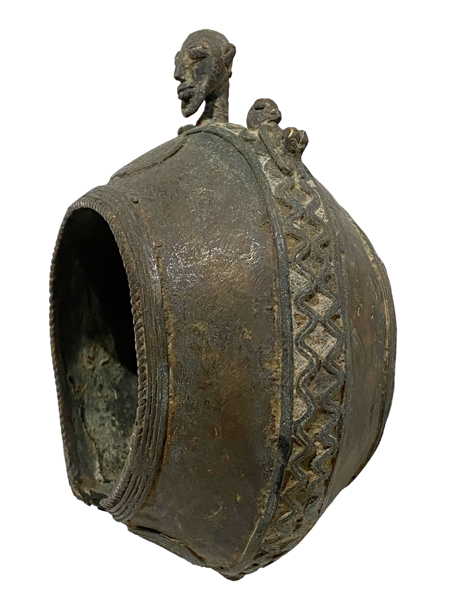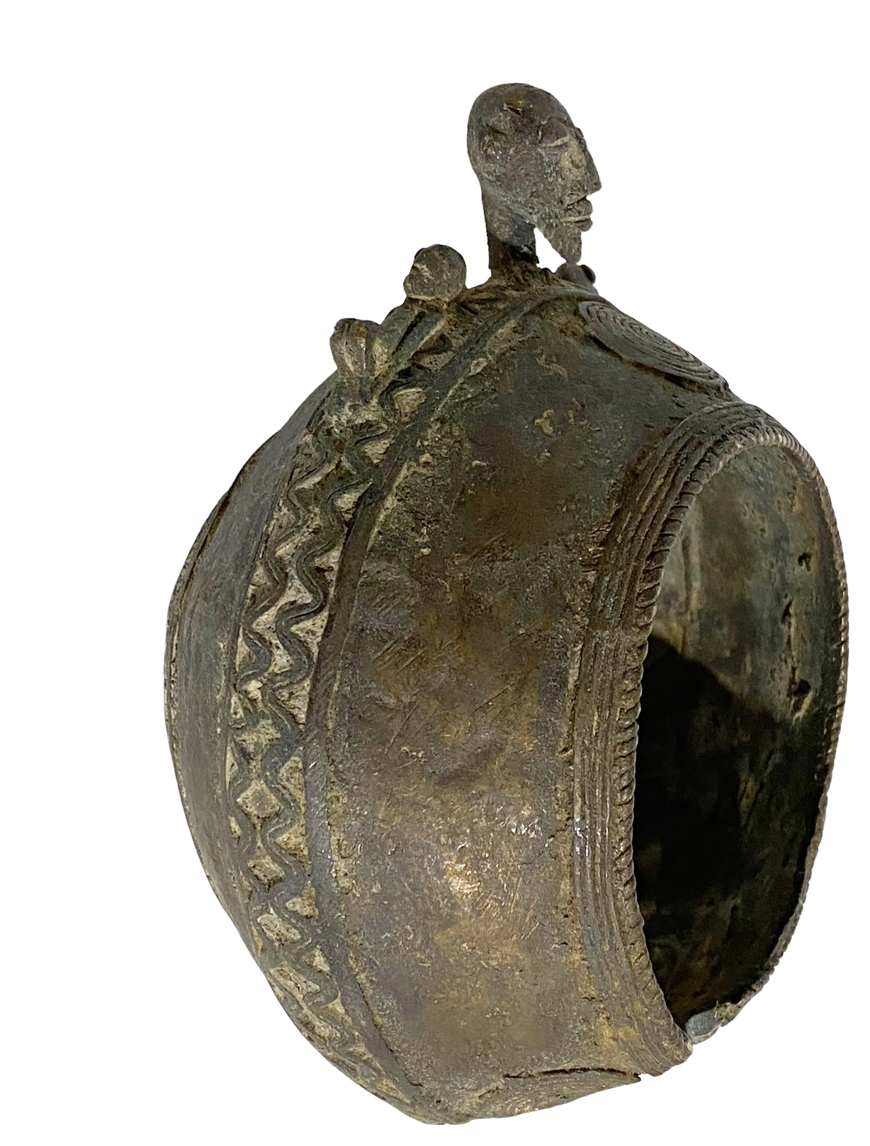 This exquisite ritual bronze currency bracelet from the Gan of Burkina Faso was crafted using the lost wax process, which makes it a one-of-a-kind piece of art. Its nice patina gives it a unique visual appeal. This bracelet measures 4.5 inches in width, 3.0 inches in depth and 6.0 inches in height.
