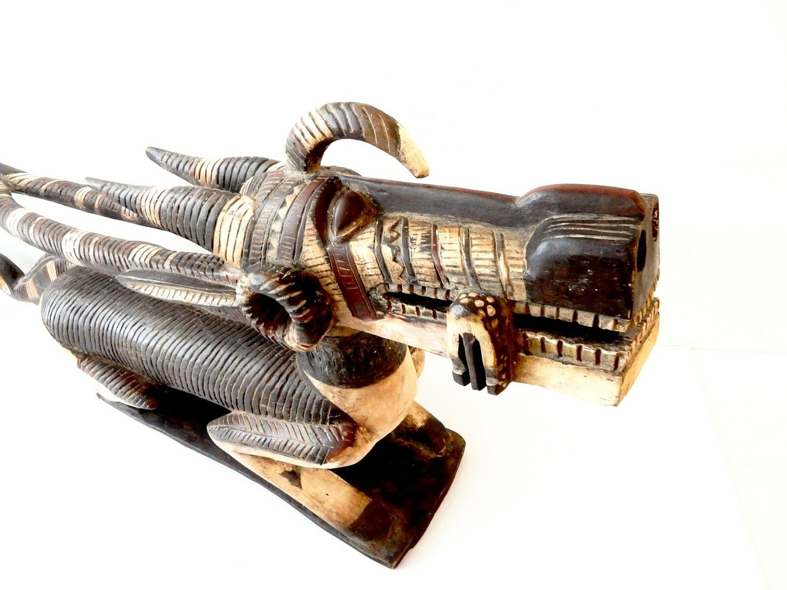 This impressive and rare Chiwara (antelope) sculpture is hand-carved from a single piece of wood and holds significant cultural and ritual significance for the Bambara tribe of Mali. Used by the initiation society to honor agriculture, this sculpture measures approximately 62" in width, 26" in height, and 11" in depth.