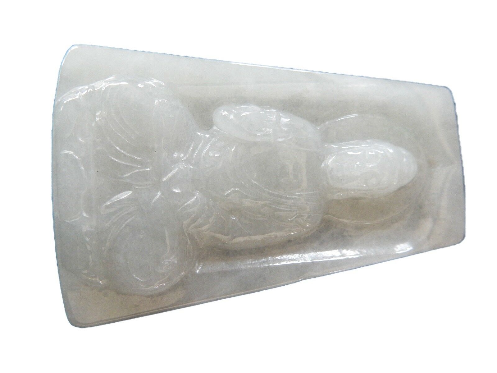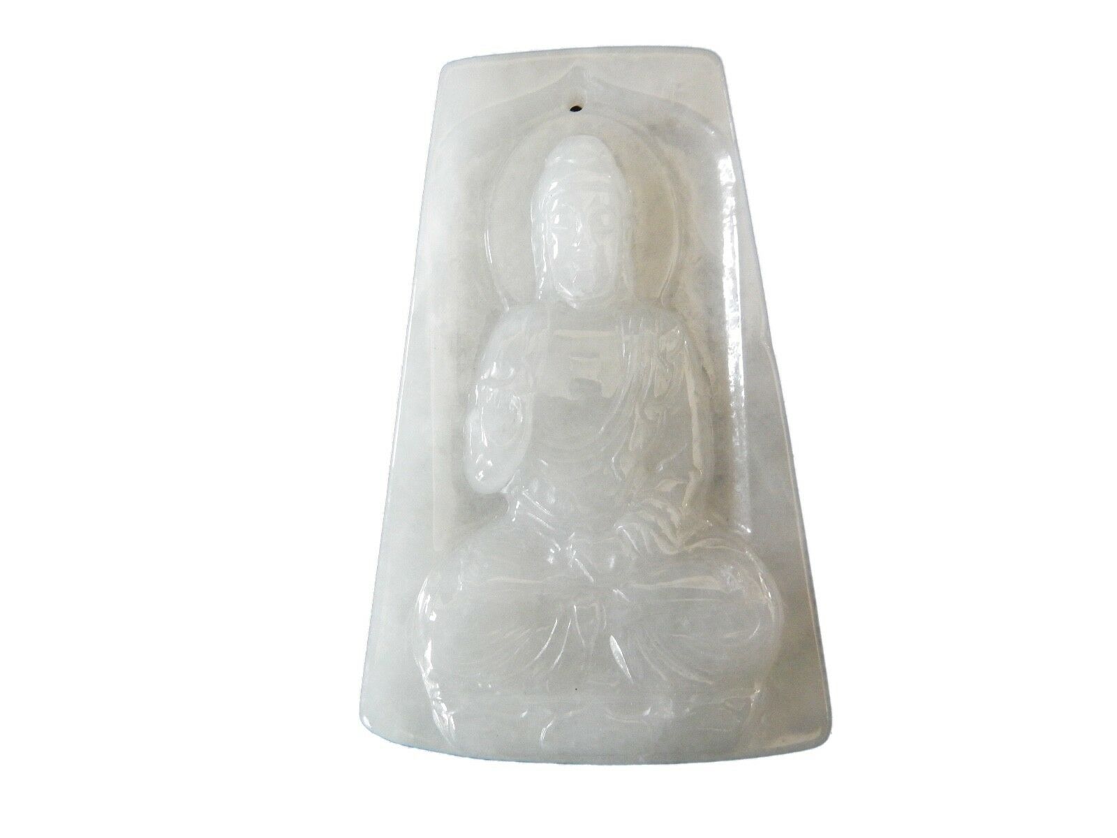 Expertly carved from high quality jadeite jade, this exquisite pendant features the divine figure of Lord Buddha in stunning, intricate detail. Measuring 2 1/2 " in height and 1.5" in width, it is a powerful symbol of good luck and prosperity.