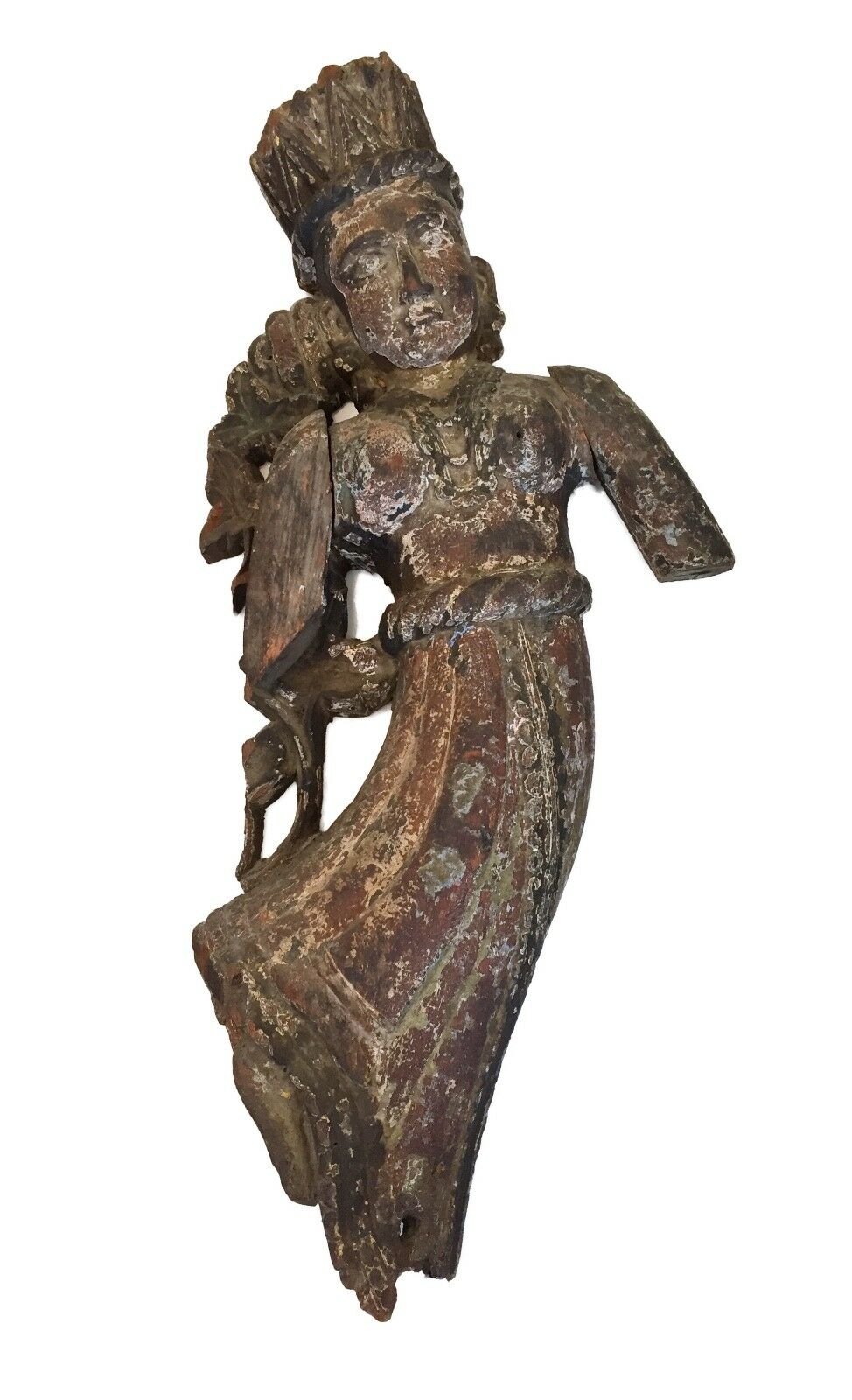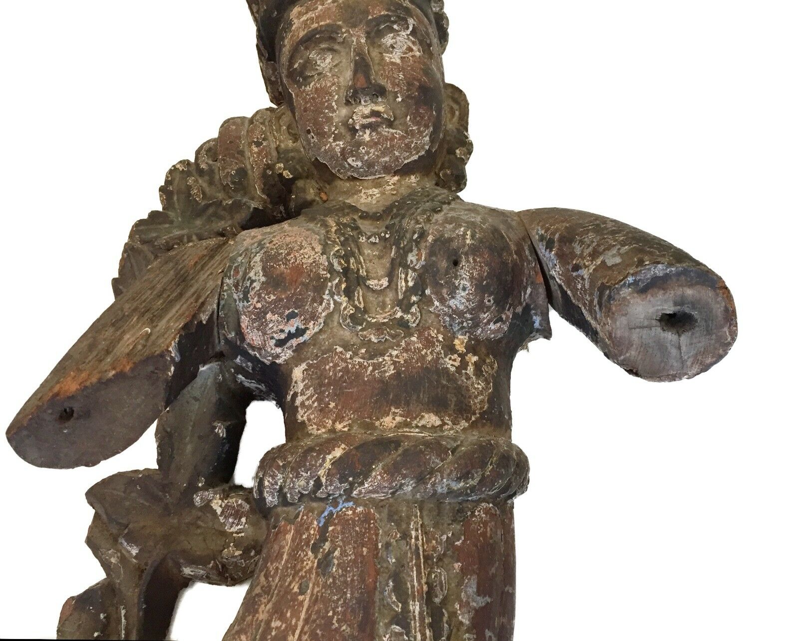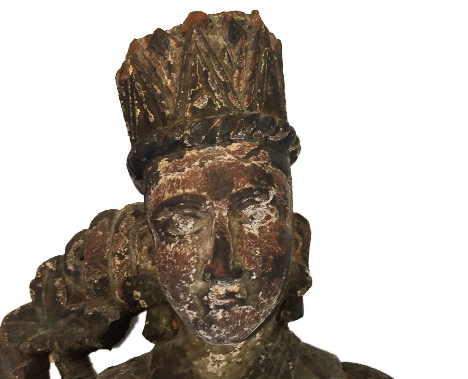 This antique Indonesian crowned angel, carved by hand from wood in the early 19th century, is a museum quality piece. Although there is wood loss due to age and use, this rare and large artwork still retains its beauty and intricate details. With articulated hands, this piece is a true testament to the skilled craftsmanship of its time period. Please refer to the images for a closer look at this remarkable 34" h x 16" w x 4" d artwork.