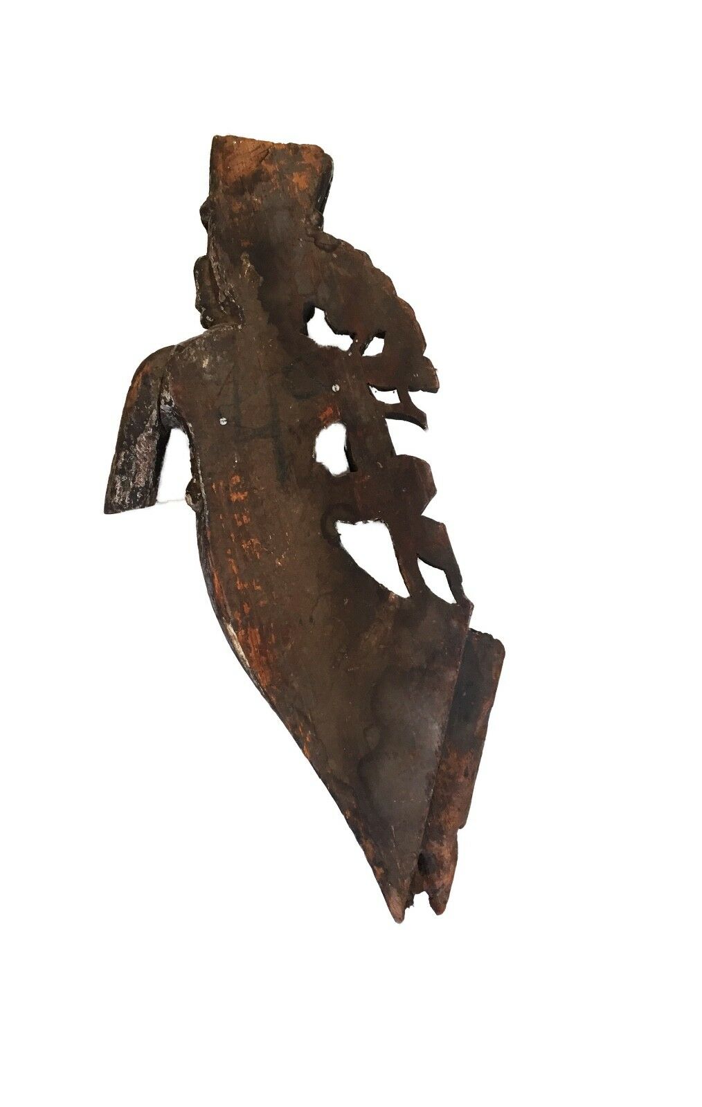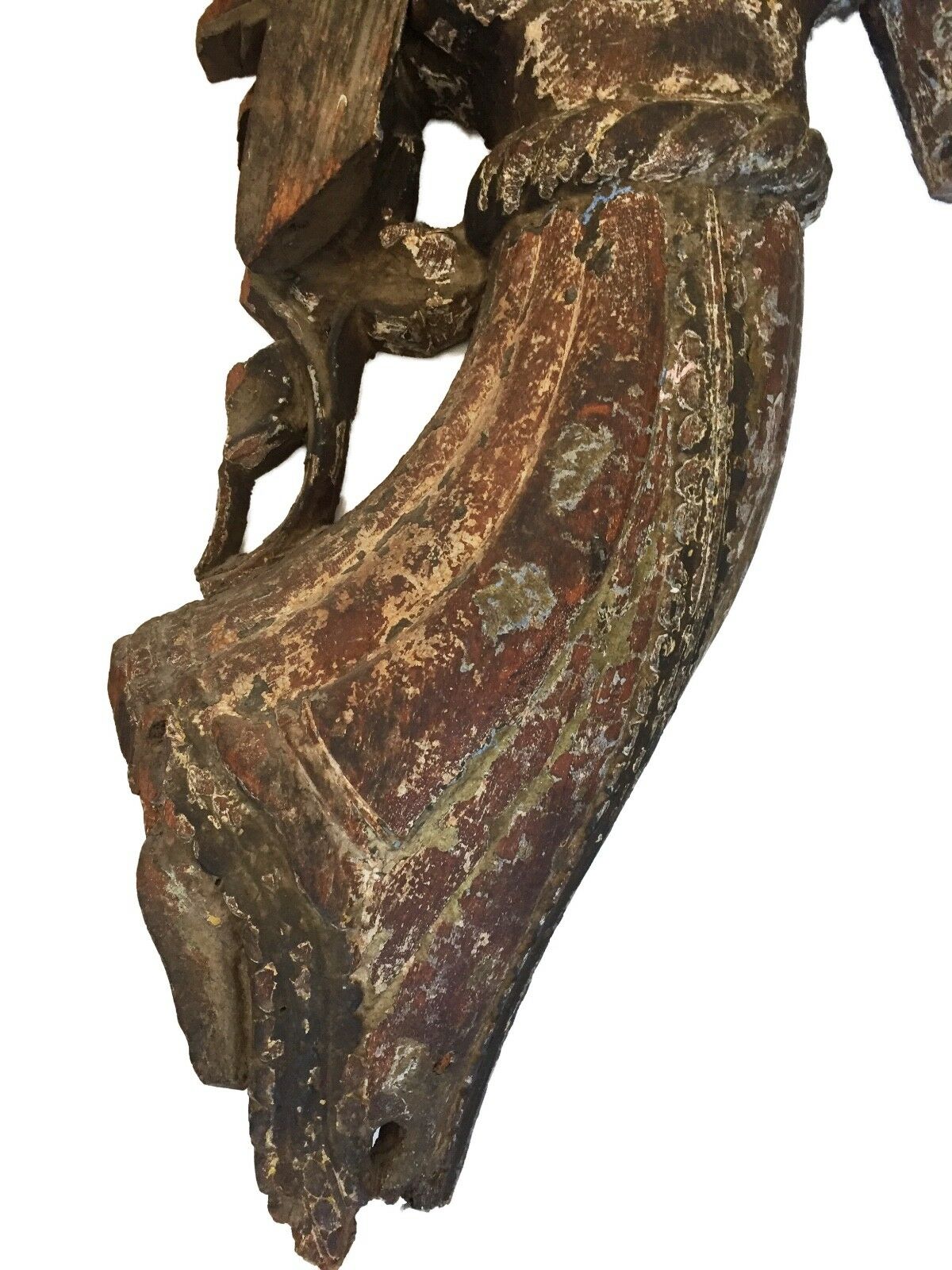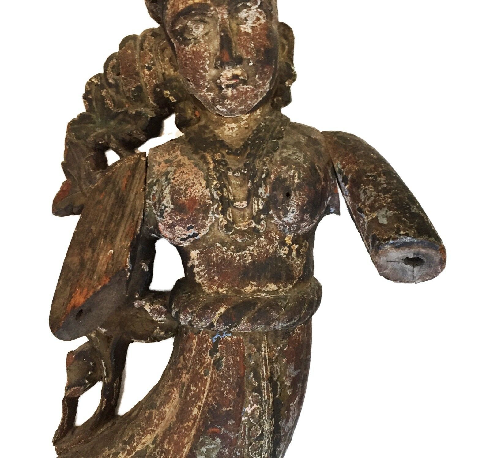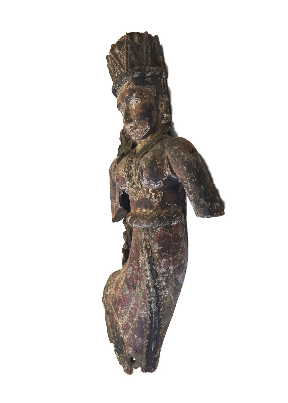 This antique Indonesian crowned angel, carved by hand from wood in the early 19th century, is a museum quality piece. Although there is wood loss due to age and use, this rare and large artwork still retains its beauty and intricate details. With articulated hands, this piece is a true testament to the skilled craftsmanship of its time period. Please refer to the images for a closer look at this remarkable 34" h x 16" w x 4" d artwork.