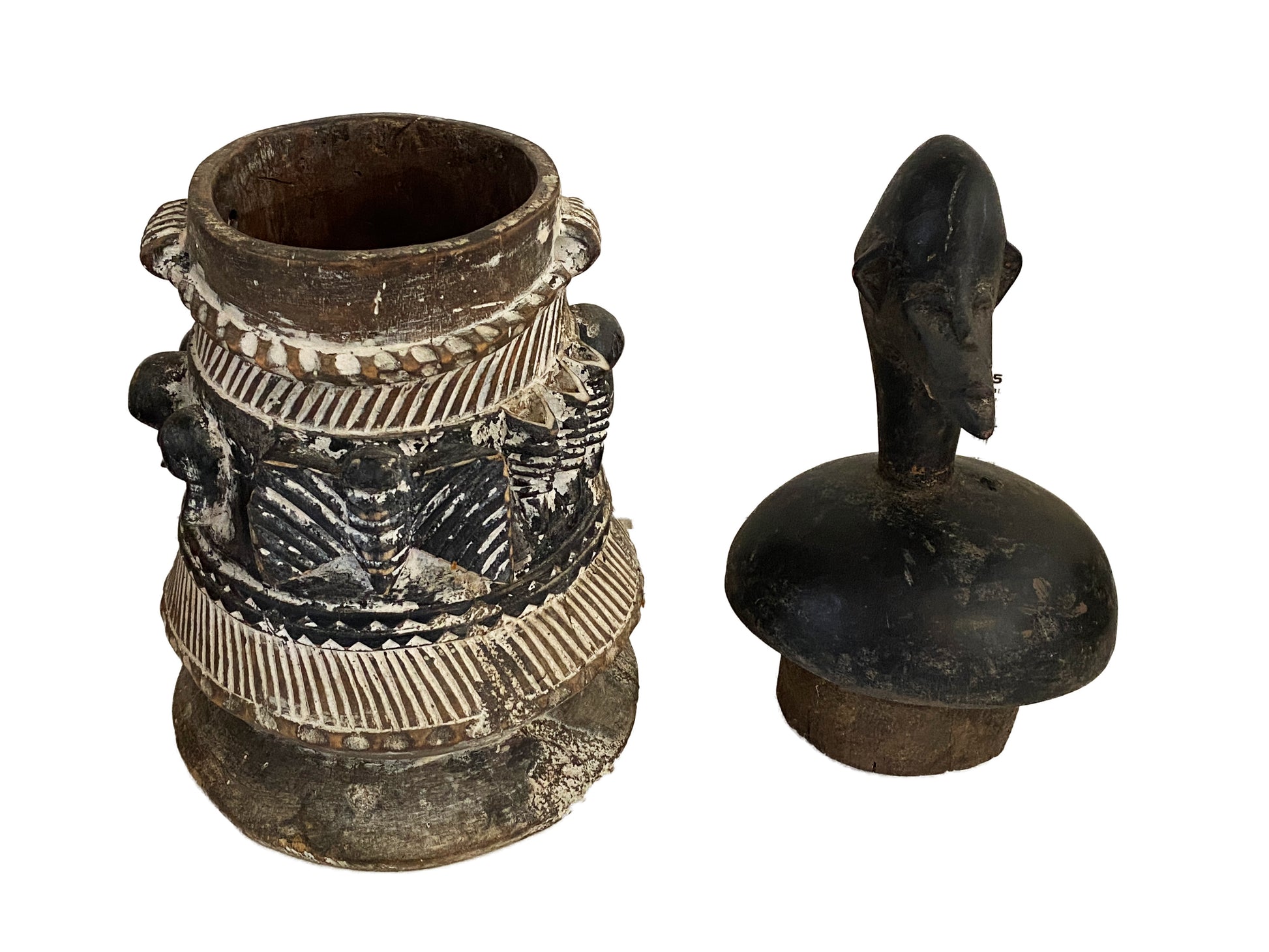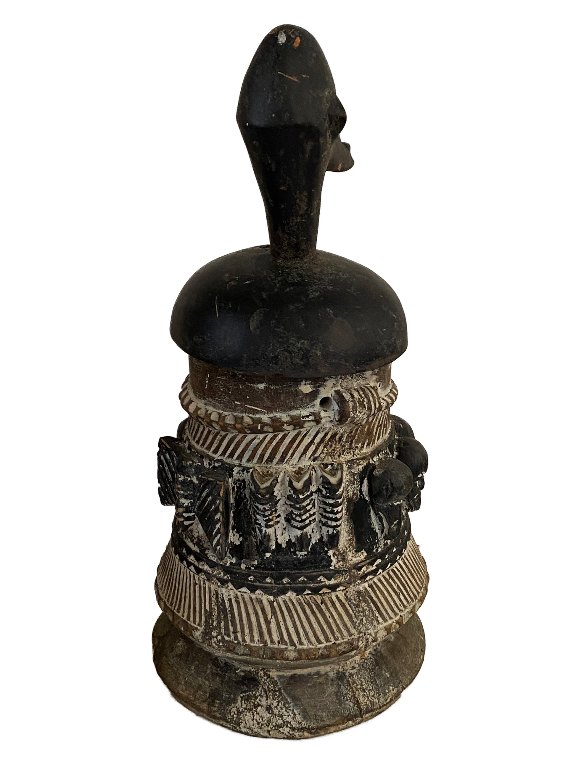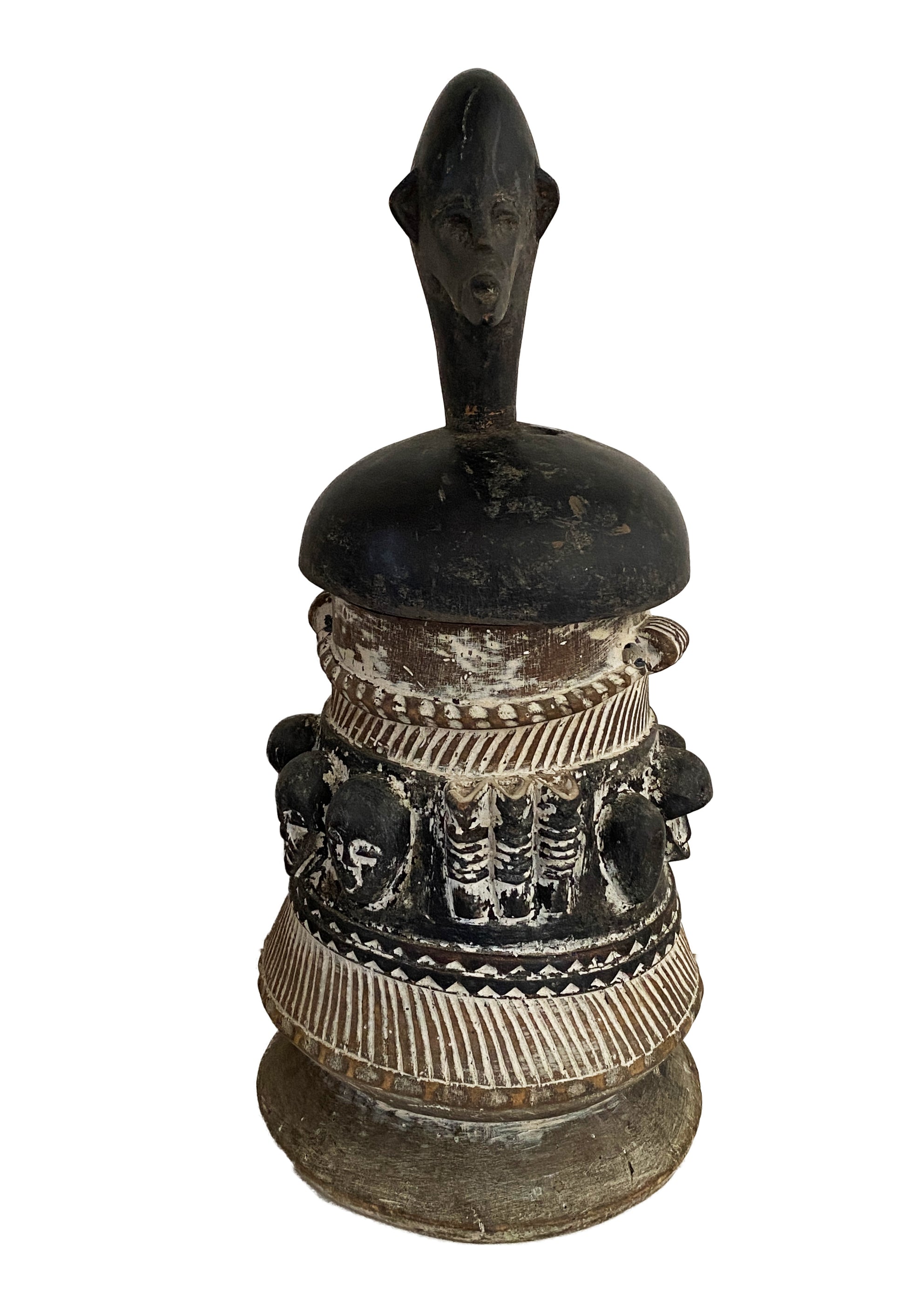 This Old African Dogon round hand carved wood box is a superb piece from a private collection. The ancestor sculpture on the top serves as a protective figure, depicting high relief ancestors--the Nomo figures--around the center, symbolizing health and longevity. The carvings were skillfully created by village blacksmiths who are believed to possess magical powers. With measurements of approximately 16.75" in width and 7.5" in diameter, this box is a stunning addition to any collection.