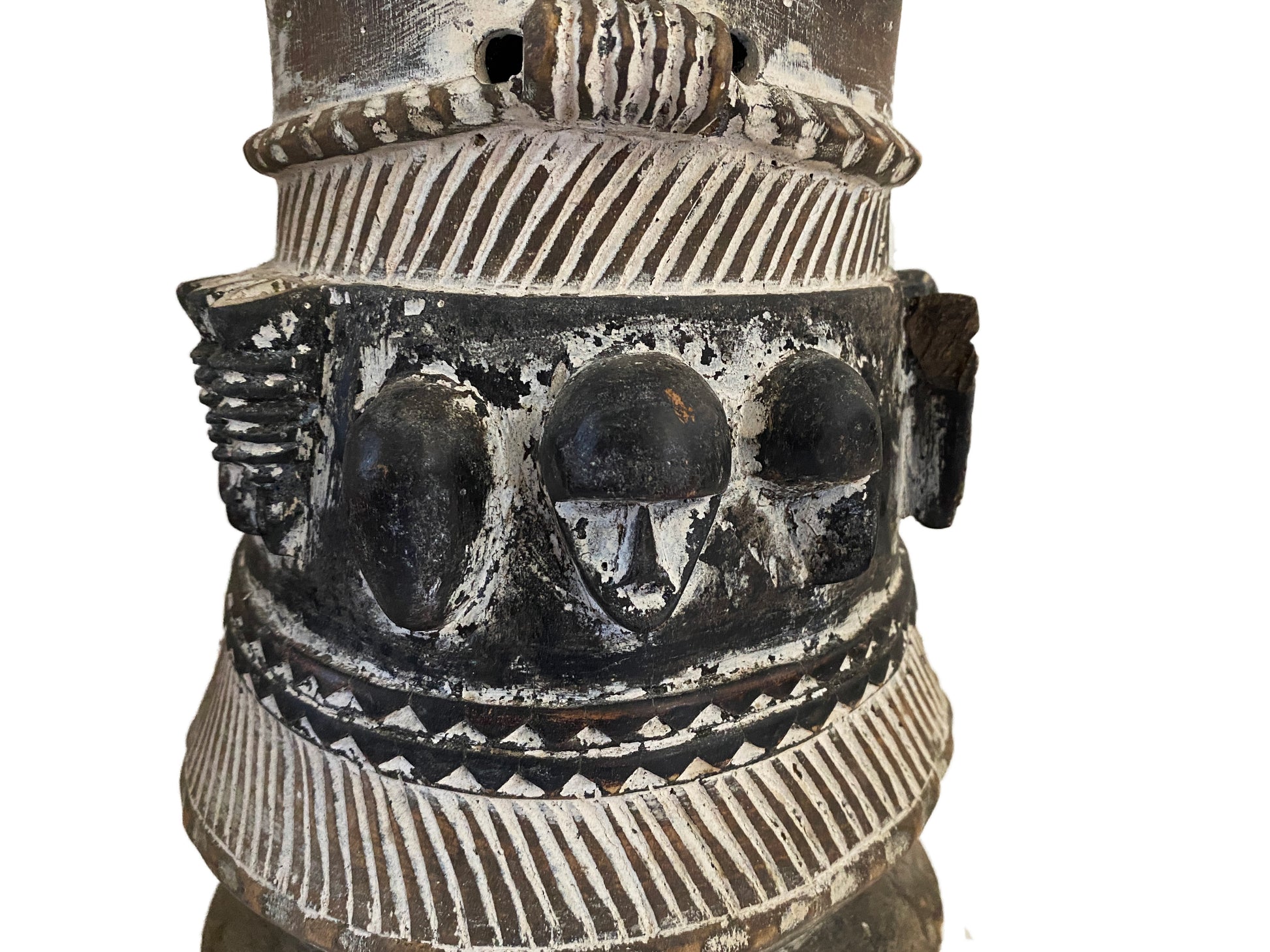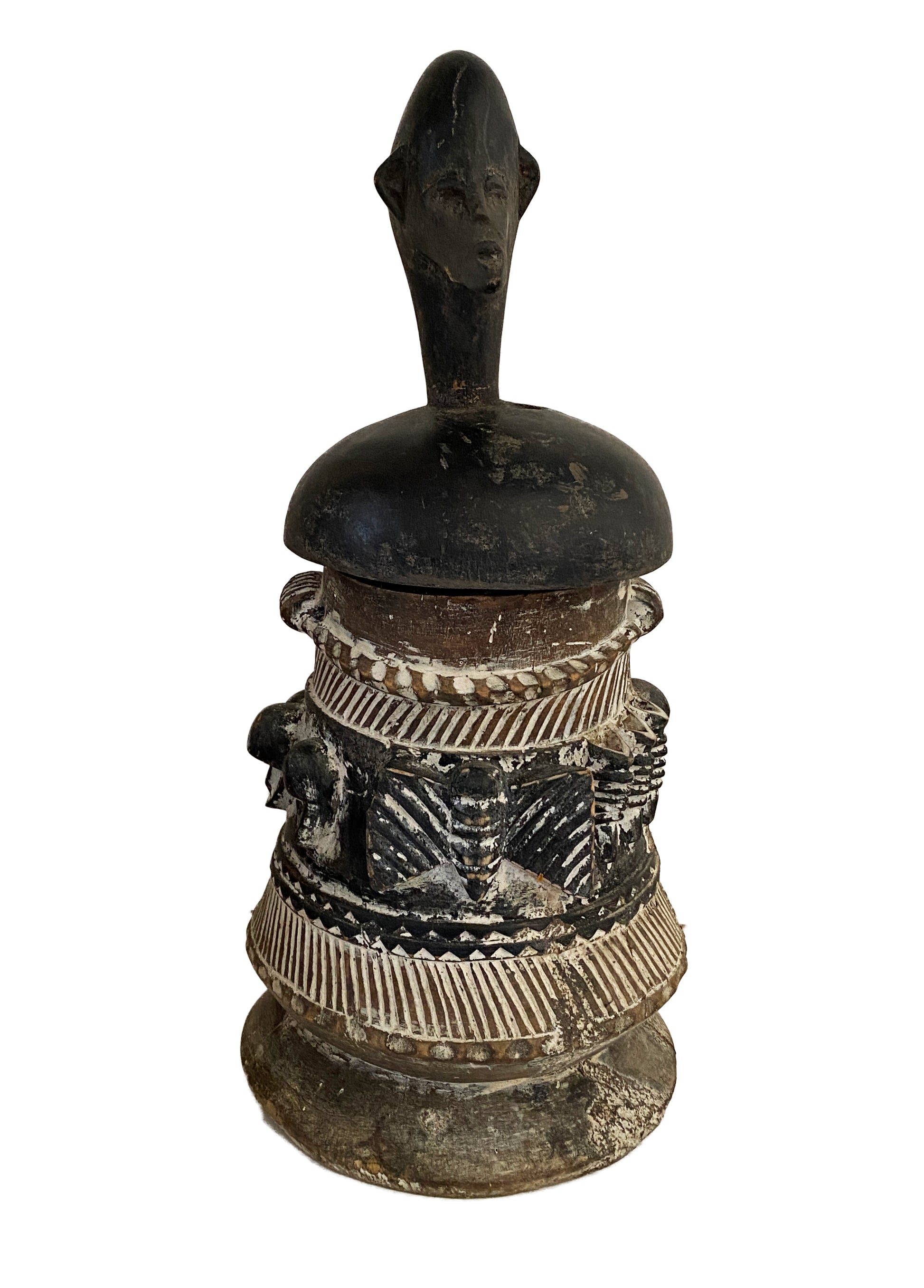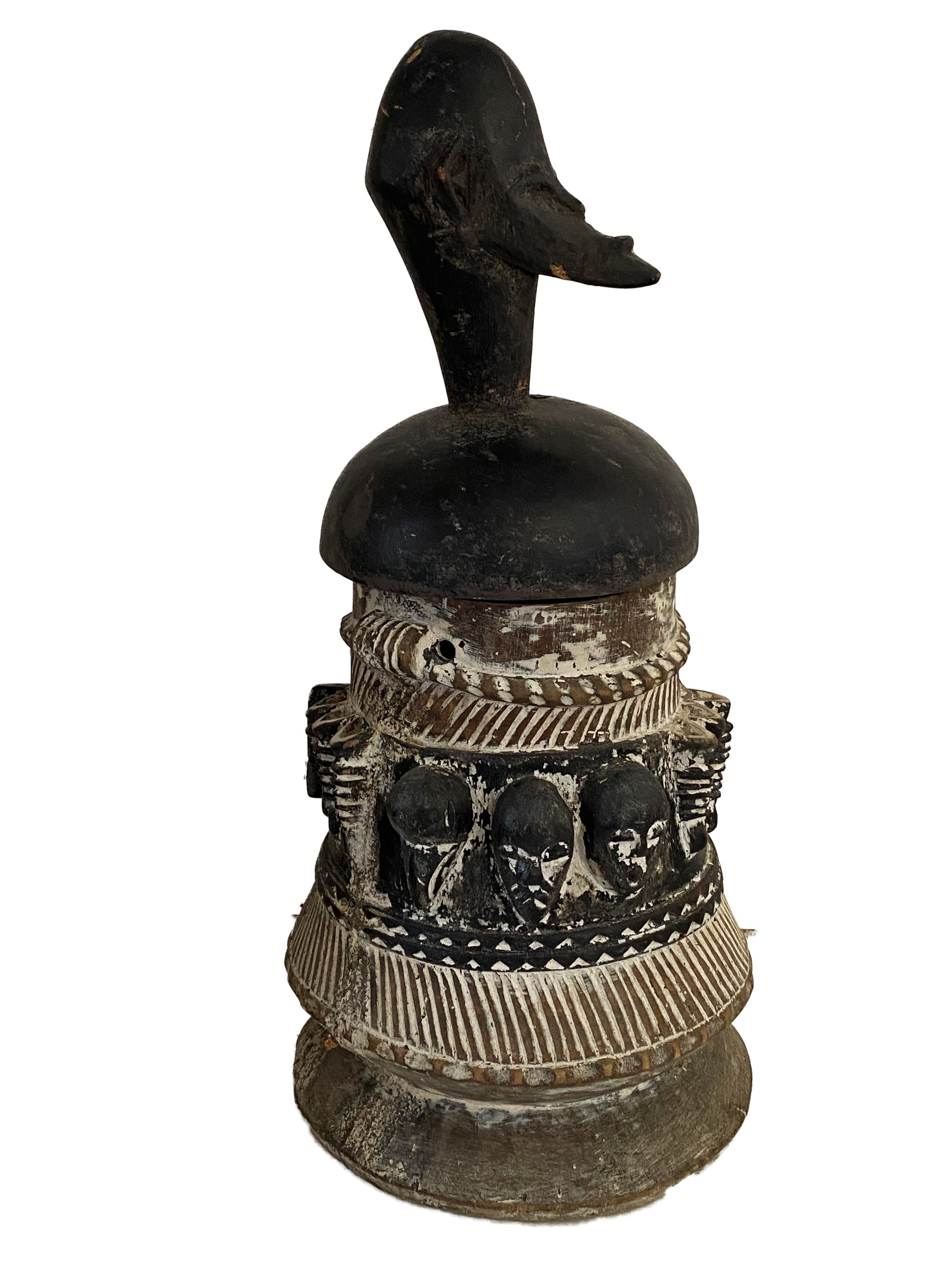 This Old African Dogon round hand carved wood box is a superb piece from a private collection. The ancestor sculpture on the top serves as a protective figure, depicting high relief ancestors--the Nomo figures--around the center, symbolizing health and longevity. The carvings were skillfully created by village blacksmiths who are believed to possess magical powers. With measurements of approximately 16.75" in width and 7.5" in diameter, this box is a stunning addition to any collection.