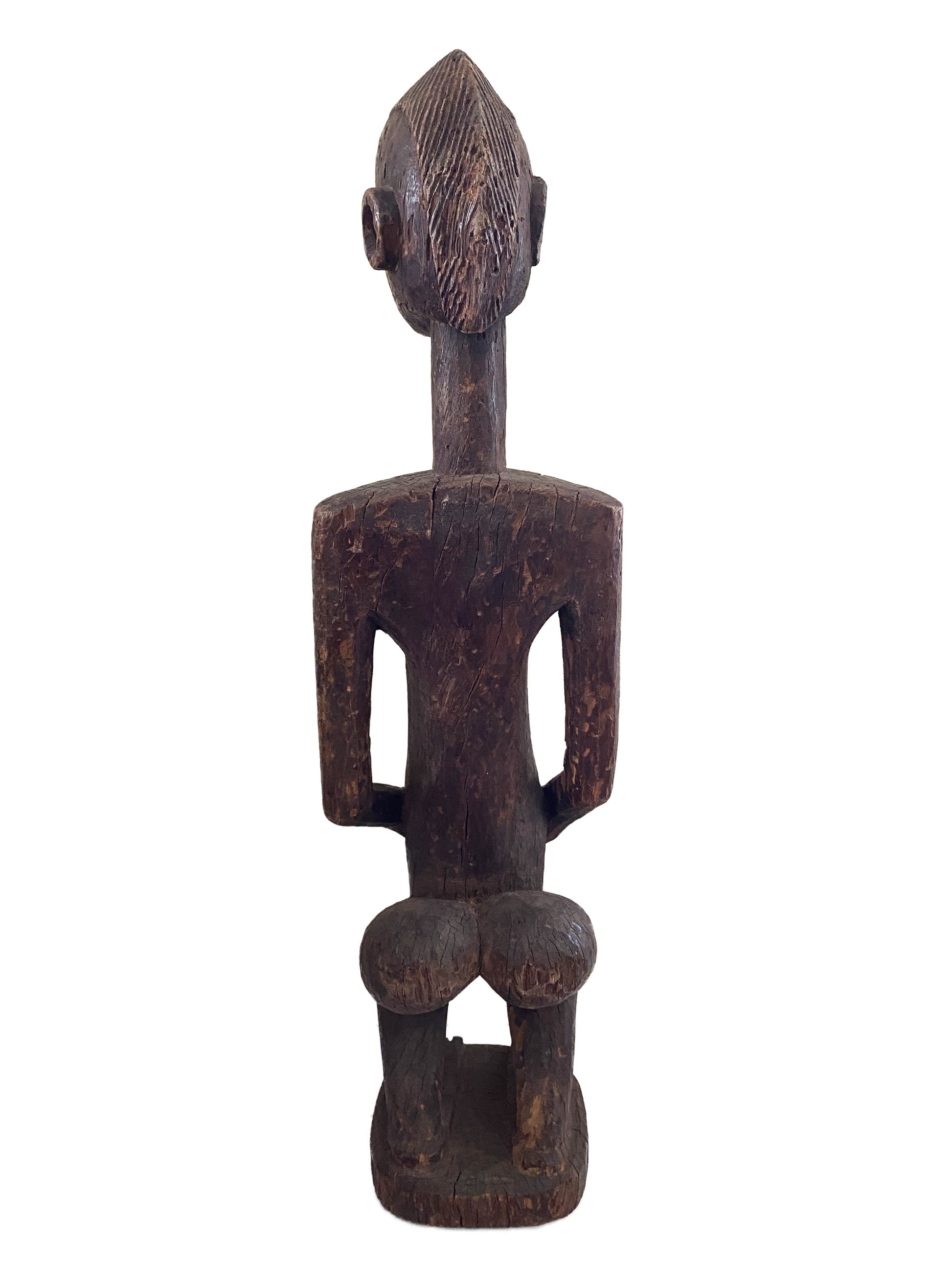Superb old hand carved pregnant Female Figure from the Bamana people , Mali . The statue features a female Bamana standing with her hands on her pregnant belly.The sculpture is used to honor women and their maternal role in ceremonies and festivals minor cracking and imperfections. please inspect photos carefully or inquire for more detail.7" L x 7" W x 28" H