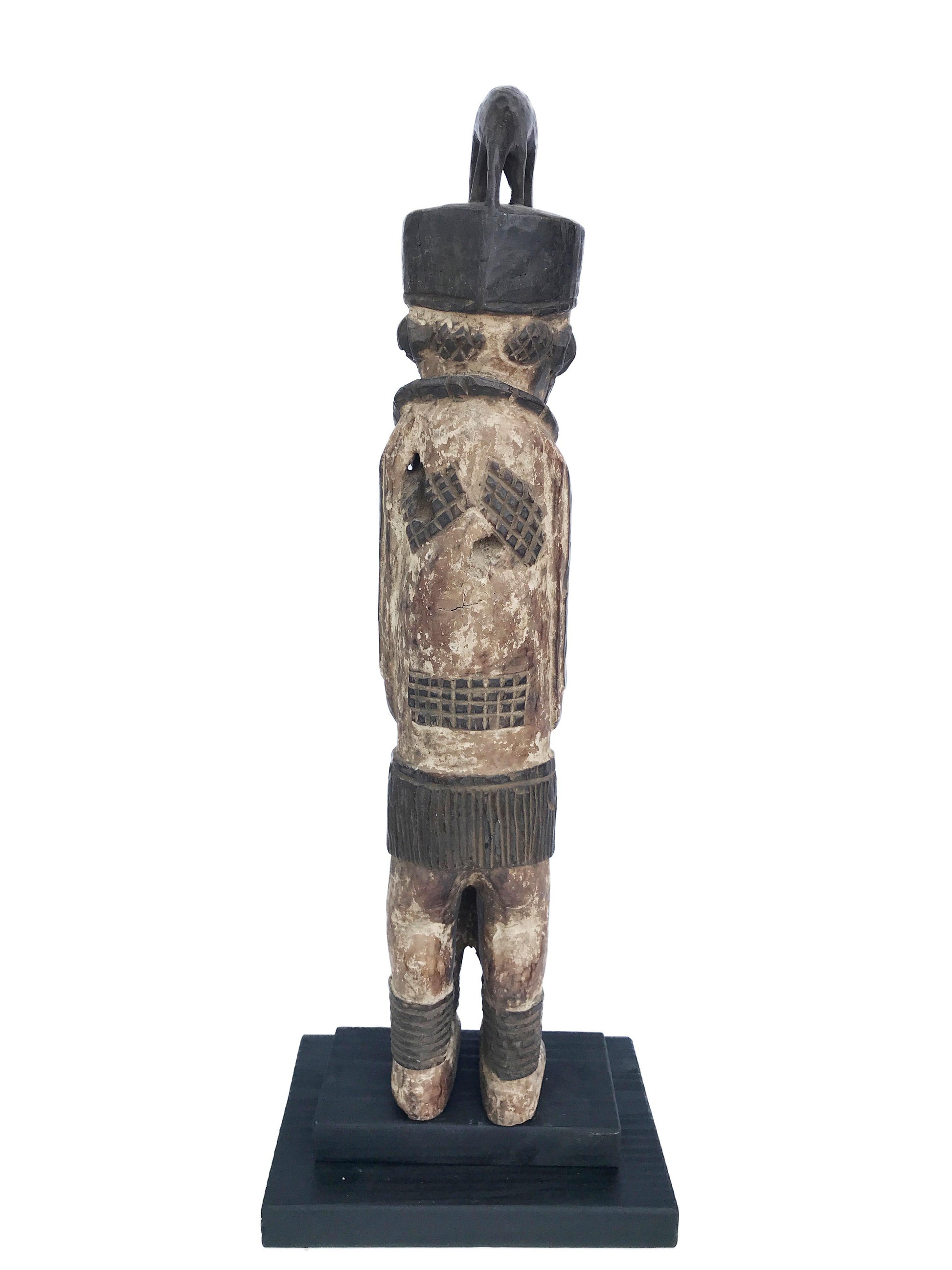 This superb Old Igbo Male Figure comes with a Monkey perched on his head, and safeguarding a young kid. This 34.5" Nigerian African sculpture reinforces the belief that ancestor and culture heroes protect the well-being of family and community. Religiously addressed in cult shrines, the sculpture's good-will is propagated with offerings to ensure a productive harvest, healthy births, and moral and socially acceptable behavior. It comes atop a custom-made wooden stand. DIMENSIONS 12.75ʺW × 9.25ʺD × 34.5ʺH