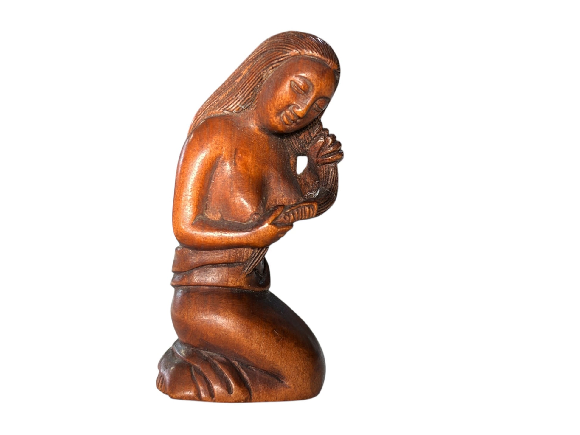 Finely carved wood netsuke figure of a seating young girl , artist's signature on the base, with holes drilled for function early to mid 20th century. Size: Length of the carving is 2 inches long and 1 inches high. Condition Report: Good condition.