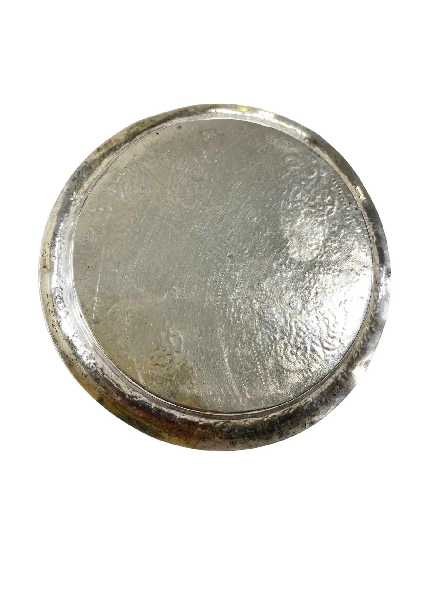 This .800-.900 coin silver dish features an ornate, yet unmarked, hammered design, standing at 3.5 inches in diameter and 0.25 inches high. An ideal choice for any art collection, the high-quality silver ensures durability and timelessness. Its classic design will be admired for generations.An insignificant dent overall structurally sound.