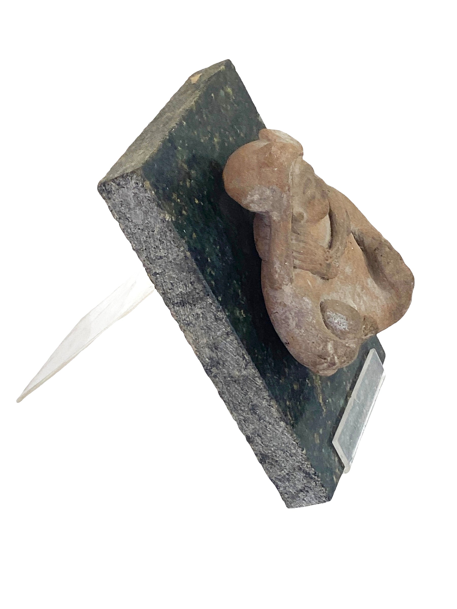 From a private collection Pre-Columbian pottery fragment of a figure holding a ball mounted on a granite stone display stand.