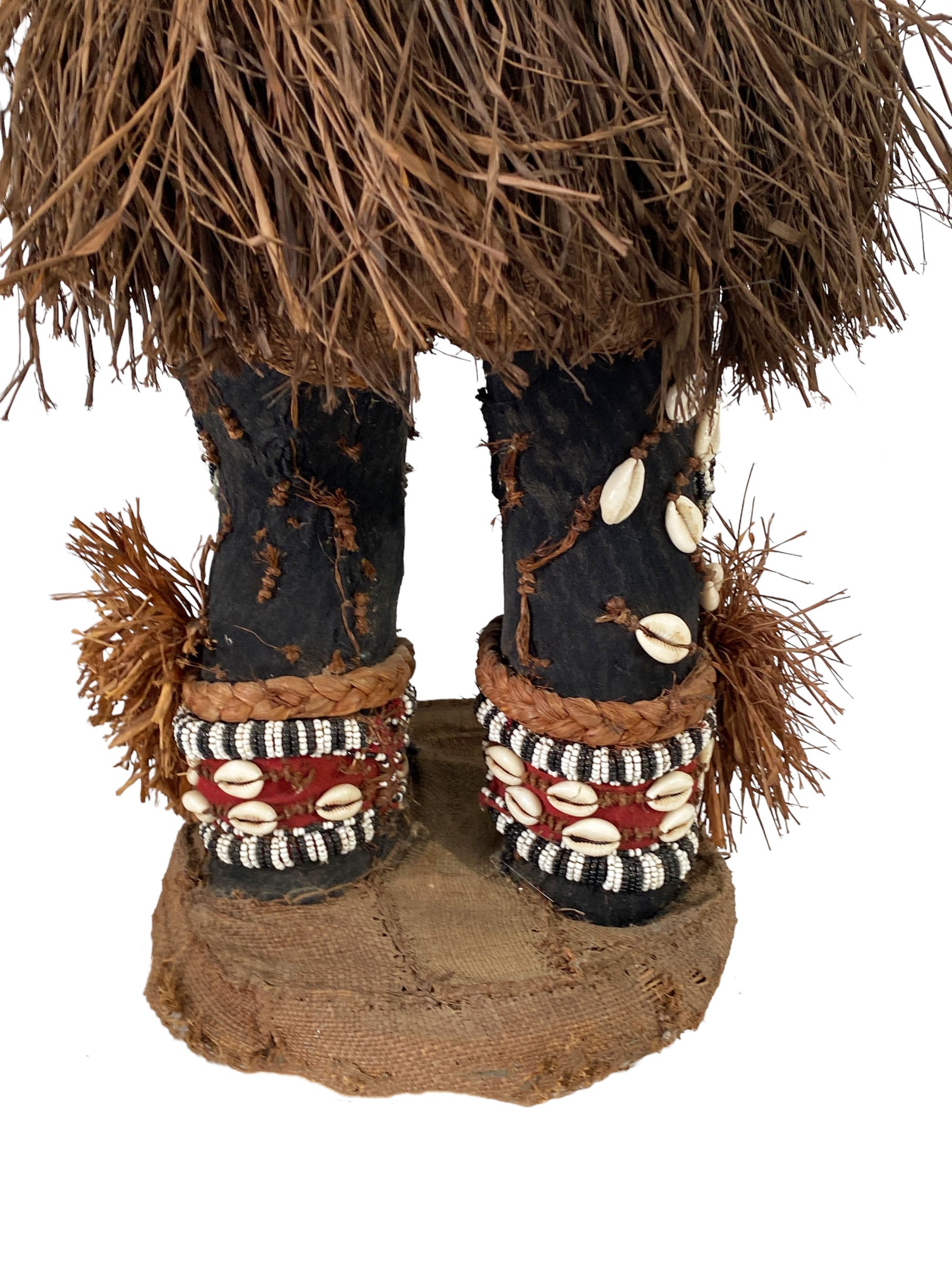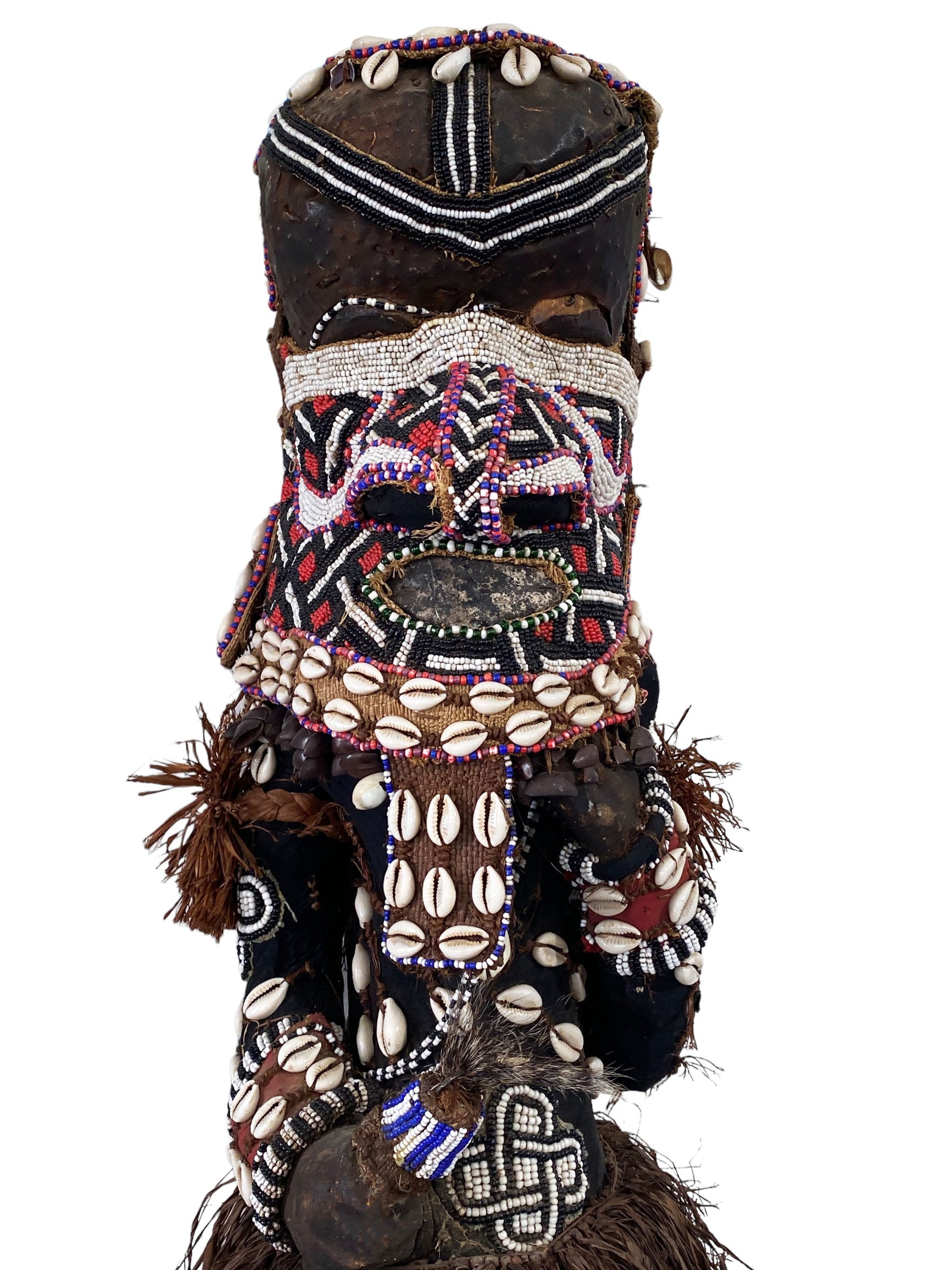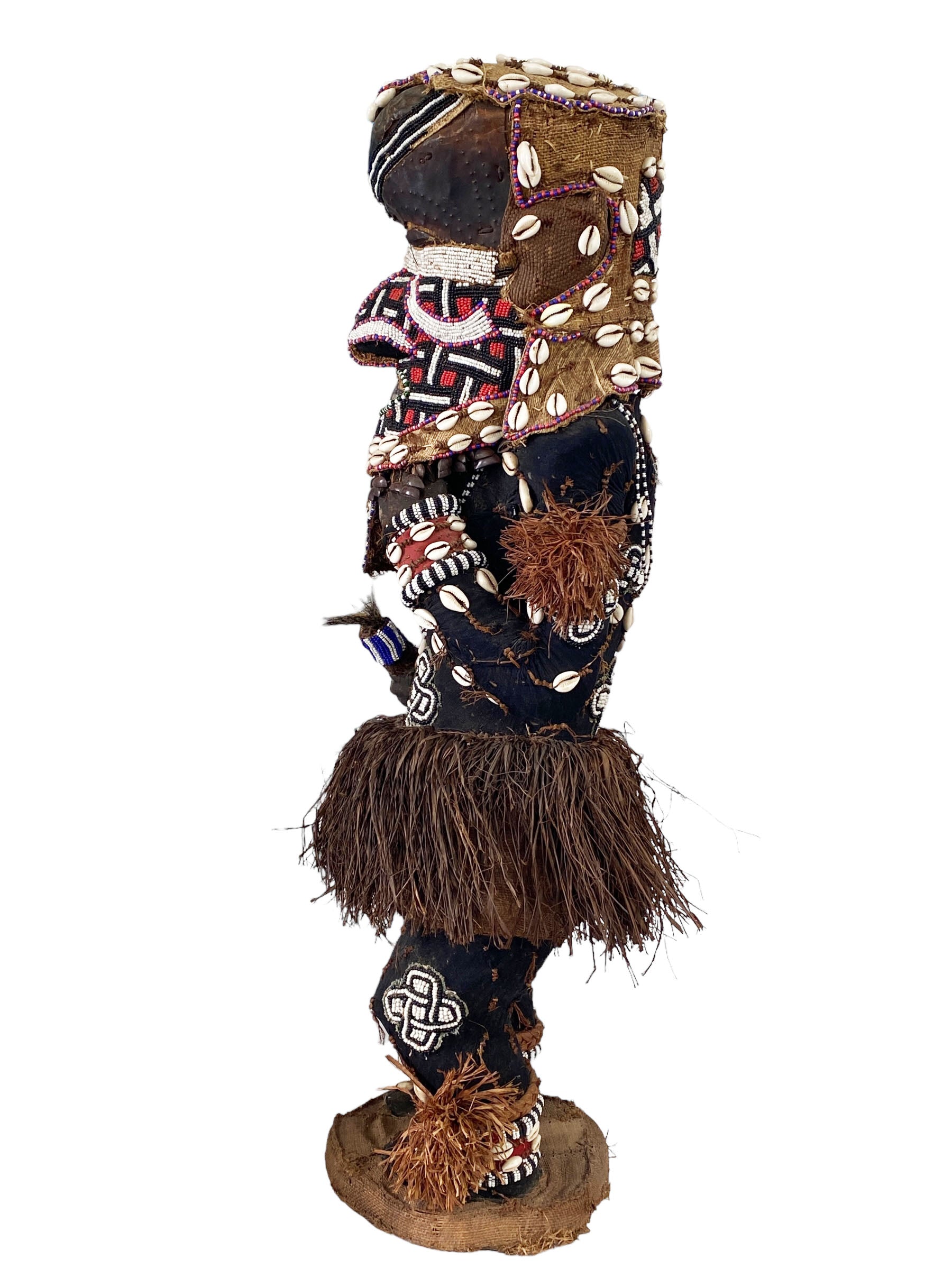 This magnificent and unique Kuba Mukenga bird dancing sculpture, known as Mukyeem, was handcrafted by the Kuba tribal people of Congo, Africa. It is made of wood, cloth, and raffia, and adorned with intricate geometric beaded designs and cowrie shells. Designed to be hold by the men of the dance society, this Mukenga is also used in ceremonies and initiation rites to symbolize the supernatural being called Woot. According to Kuba beliefs, Woot was the first human and the creator of all animals and things in existence. The Kuba are often referred to as the "Children of Woot." This eye-catching sculpture stands at 32 inches in height and measures 9 inches in both width and depth, making it a truly remarkable and significant piece.