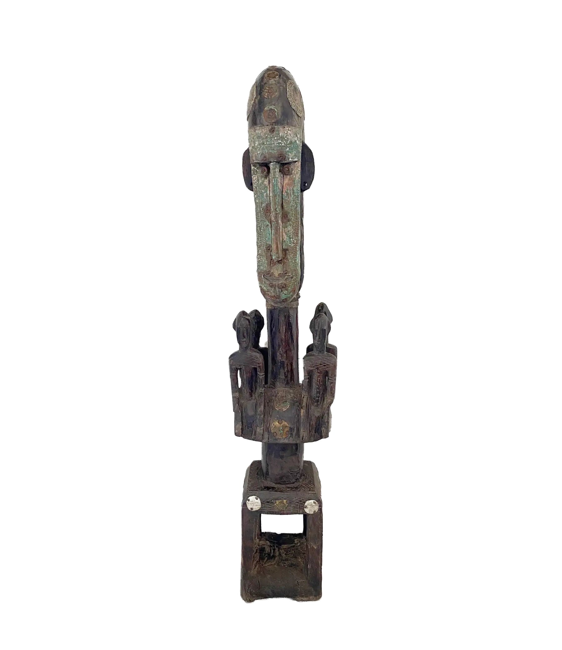 This Rare Vintage Carved of one piece of Wood Dogon /Marka tribe Figural Tellem Sculpture stands at an impressive 32" H by 7"m w by 6.5" D , showcasing a family of Ancestors with a stunning patina and brass metal studs. The male and female couple depicted in this piece represents the vital balance between men and women in Dogon culture and is a common theme in their symbolic art. The intricate details and symbolic meaning make this piece a valuable addition to any collection.