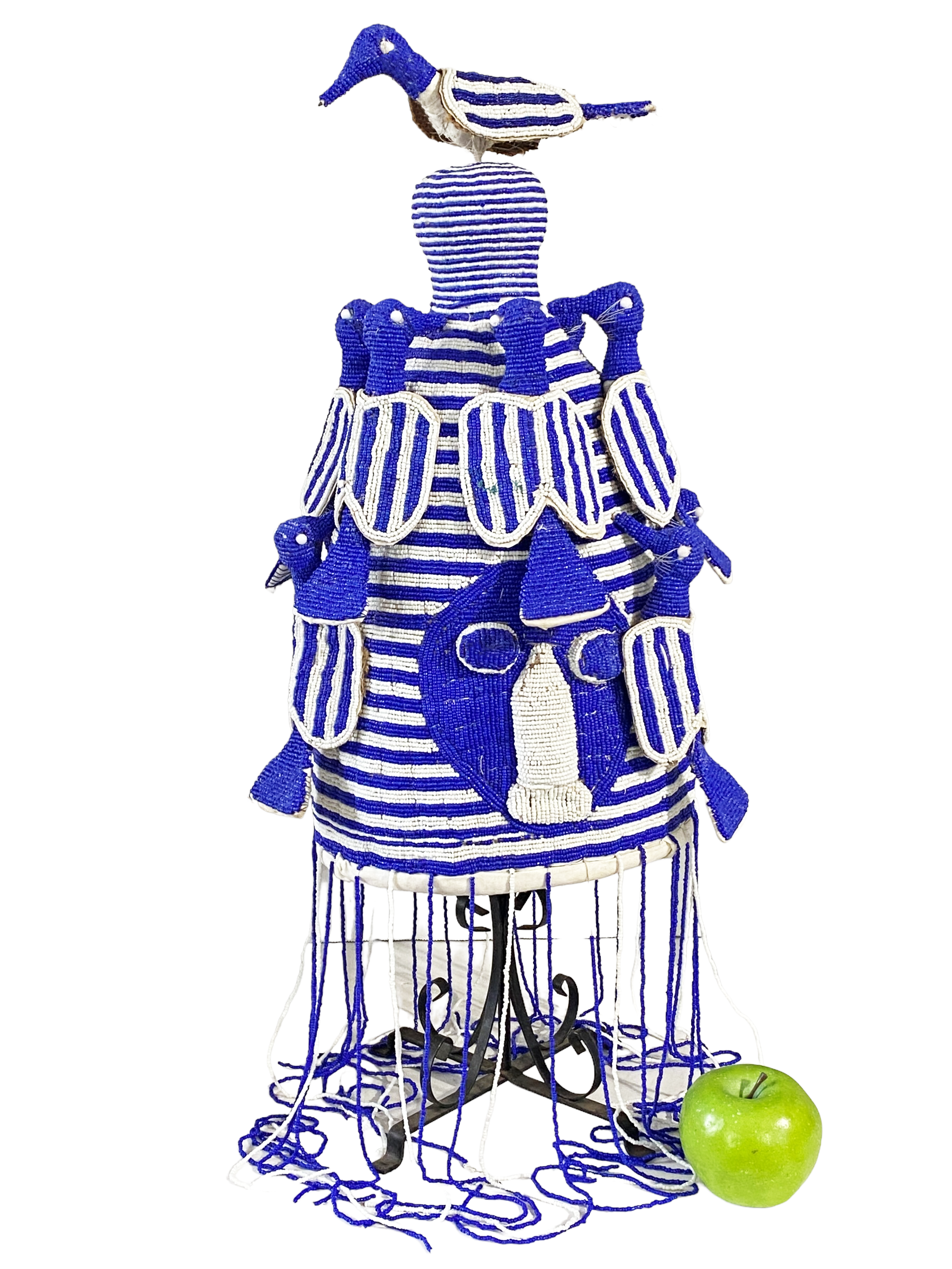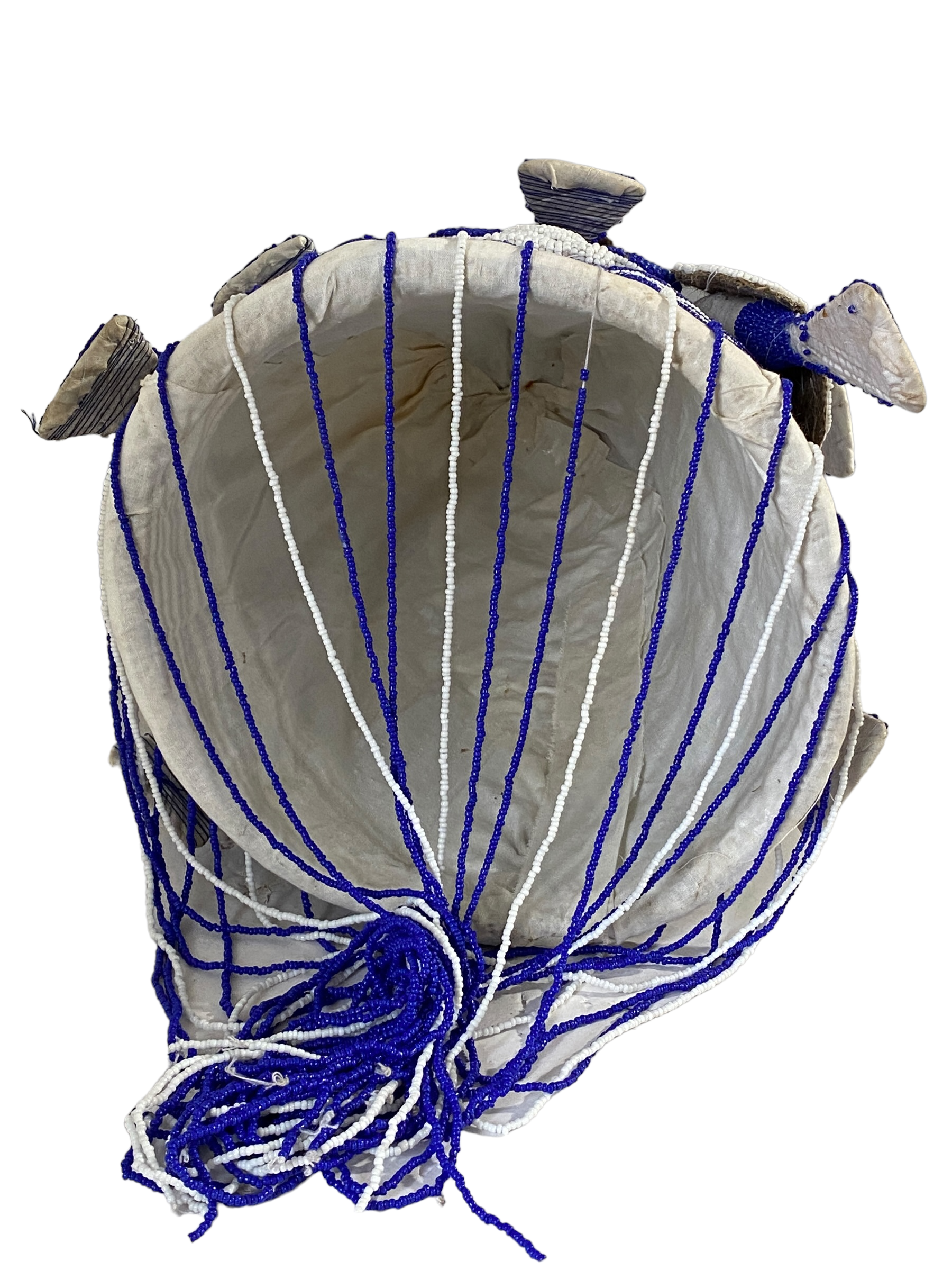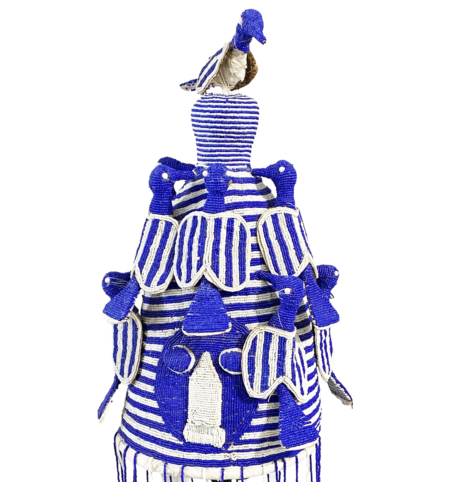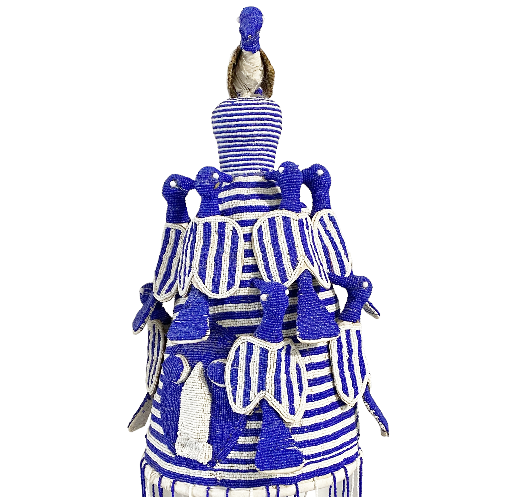 Superb African Yoruba King beaded crown with veil nicely embellished with blue and white beads and decorated with abstract motifs and faces, and birds.