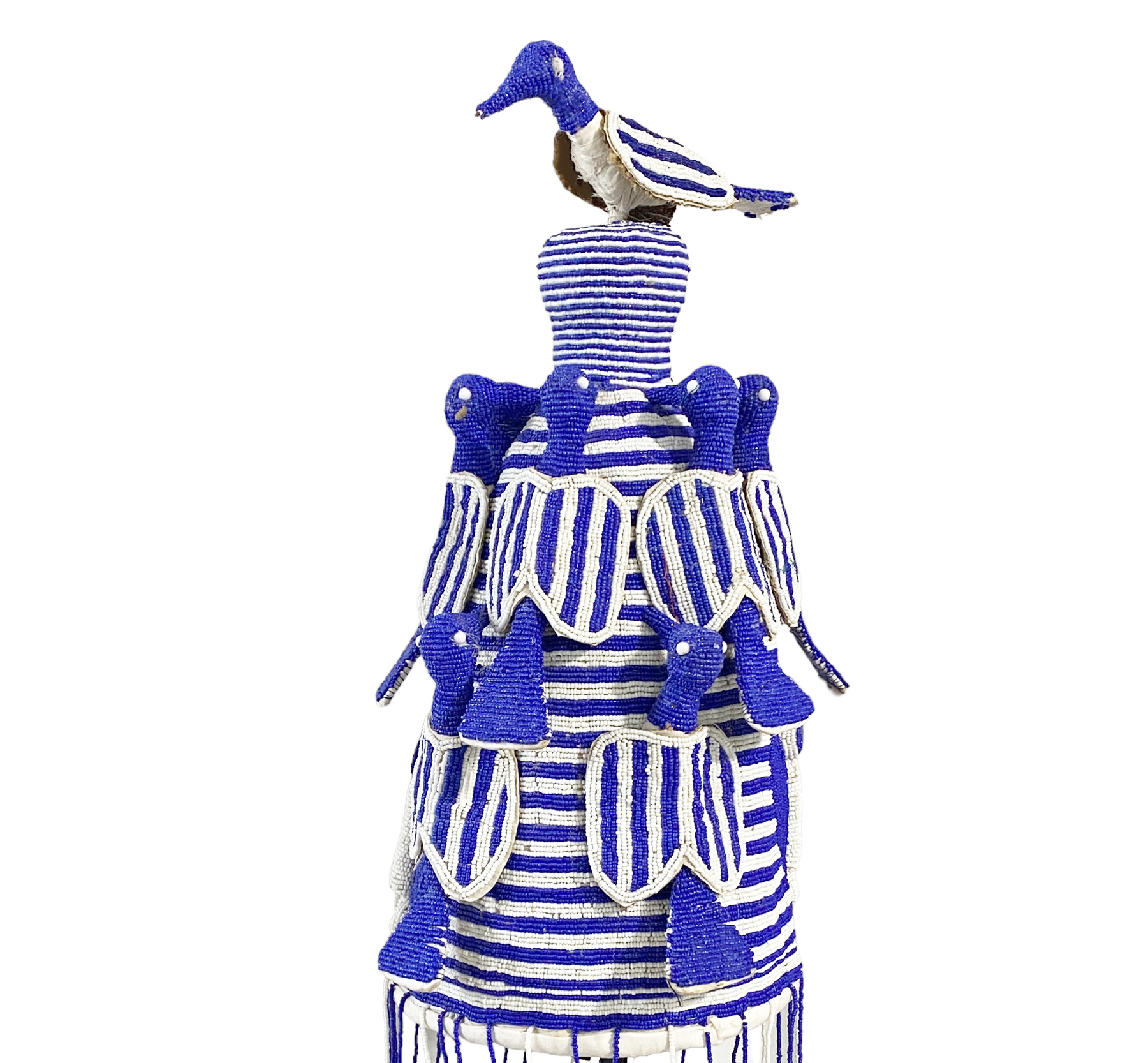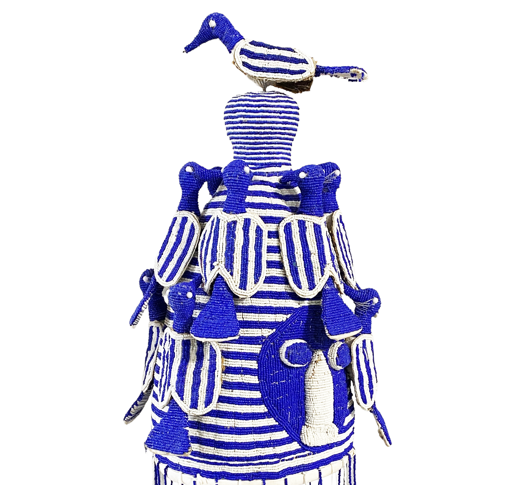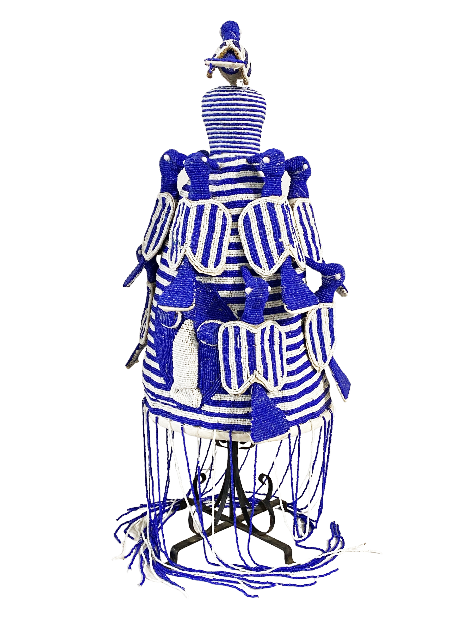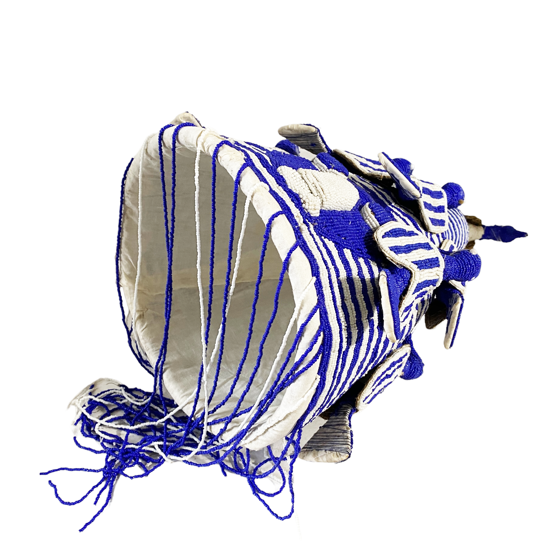Superb African Yoruba King beaded crown with veil nicely embellished with blue and white beads and decorated with abstract motifs and faces, and birds.