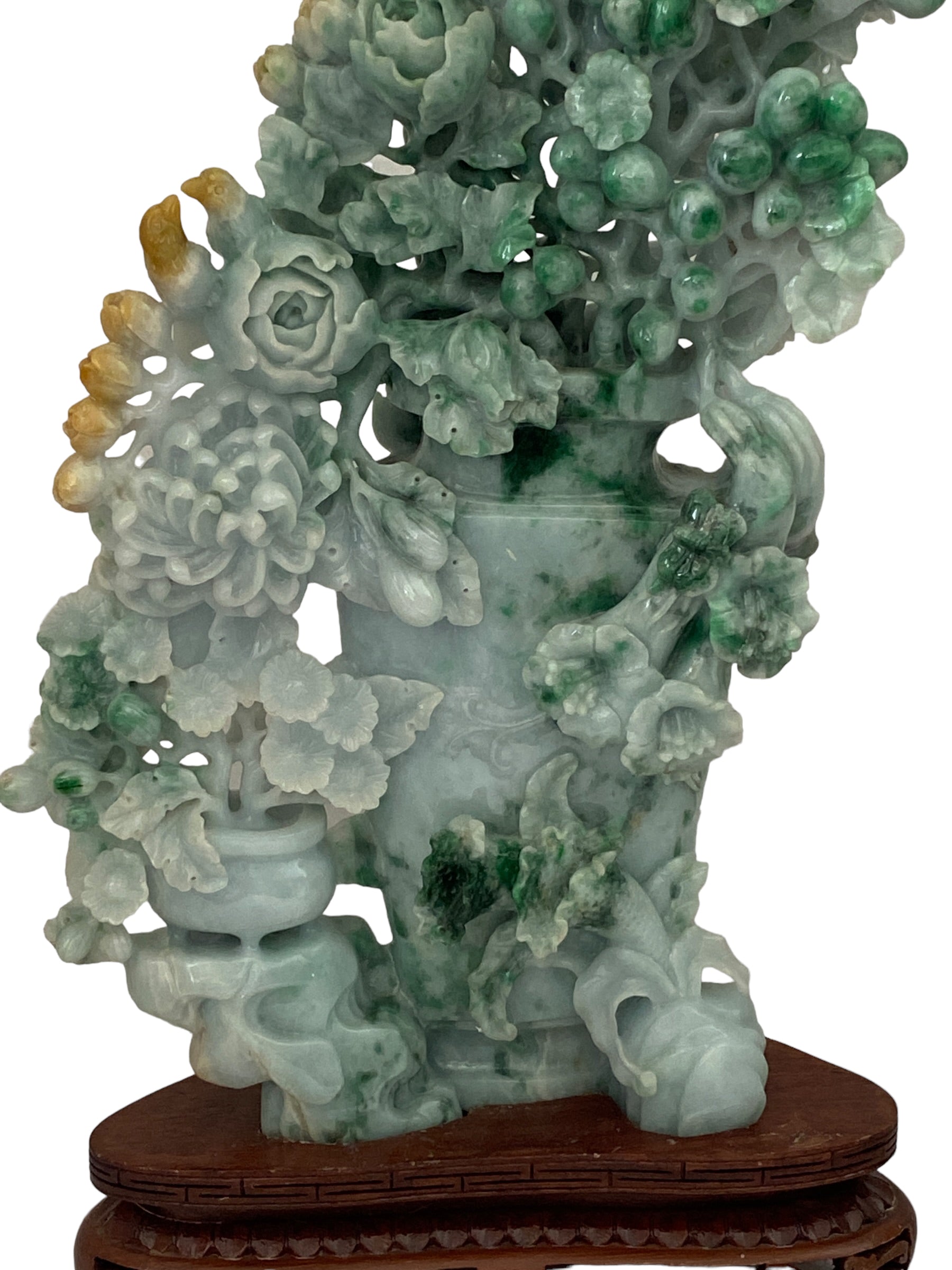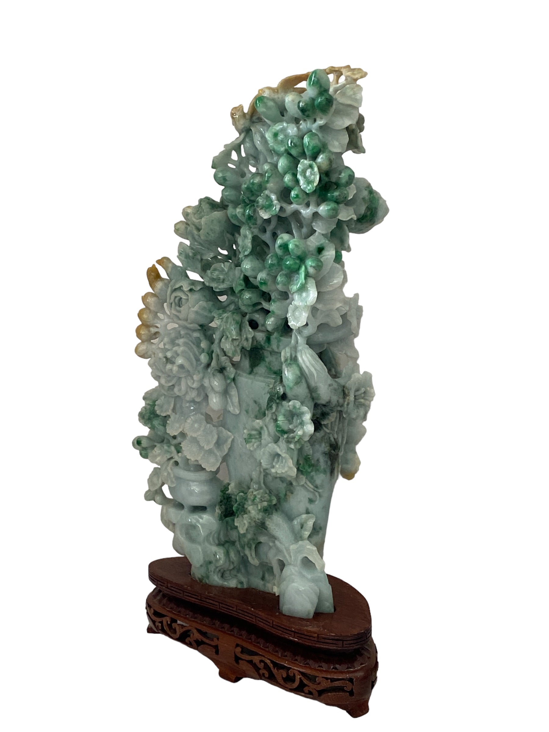 This sculpture features intricate details and elegant designs that will truly stand out in any home. Representing wealth, prosperity, and luck, this jadeite jade of peonies is a meaningful addition to any collection.