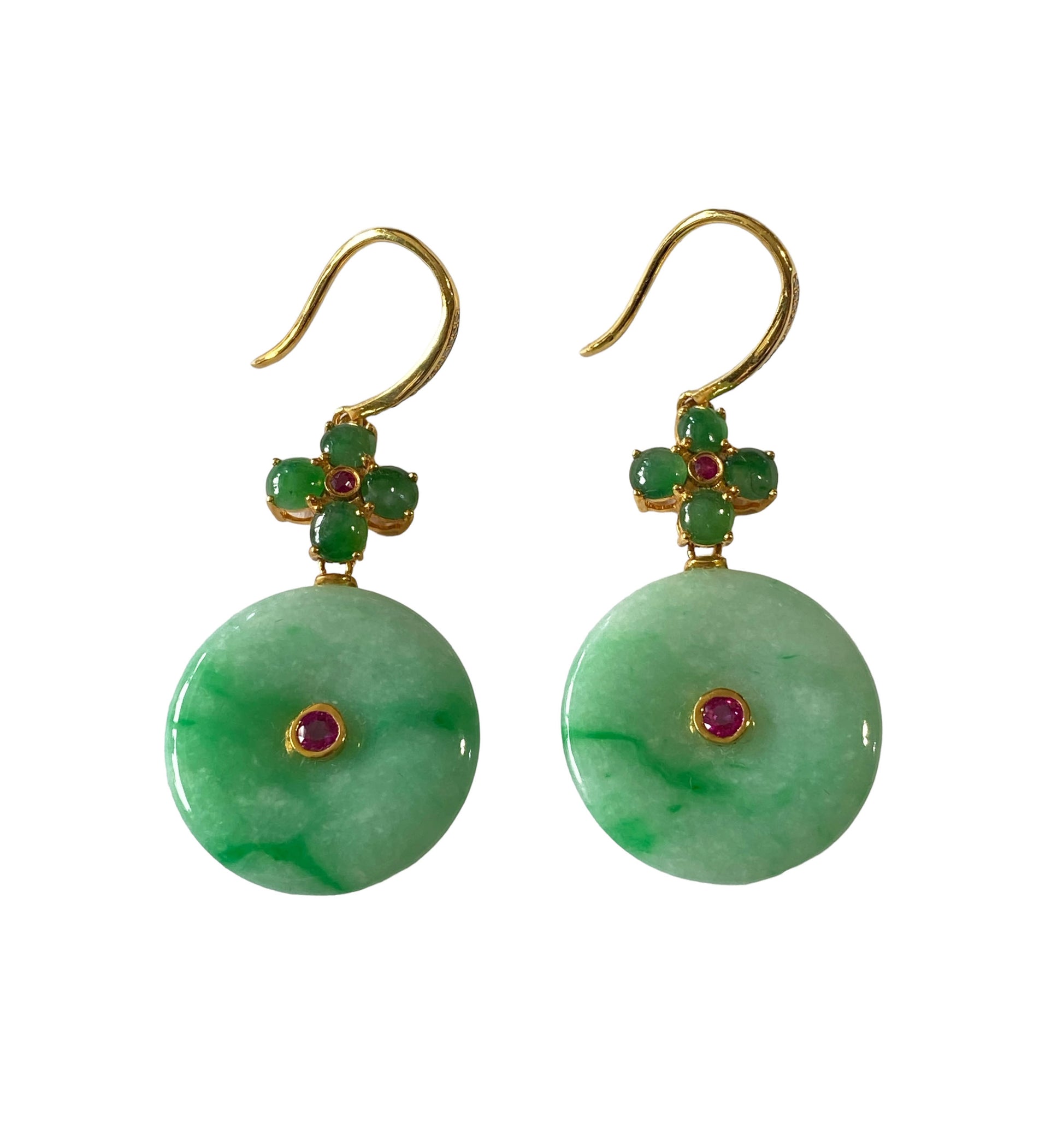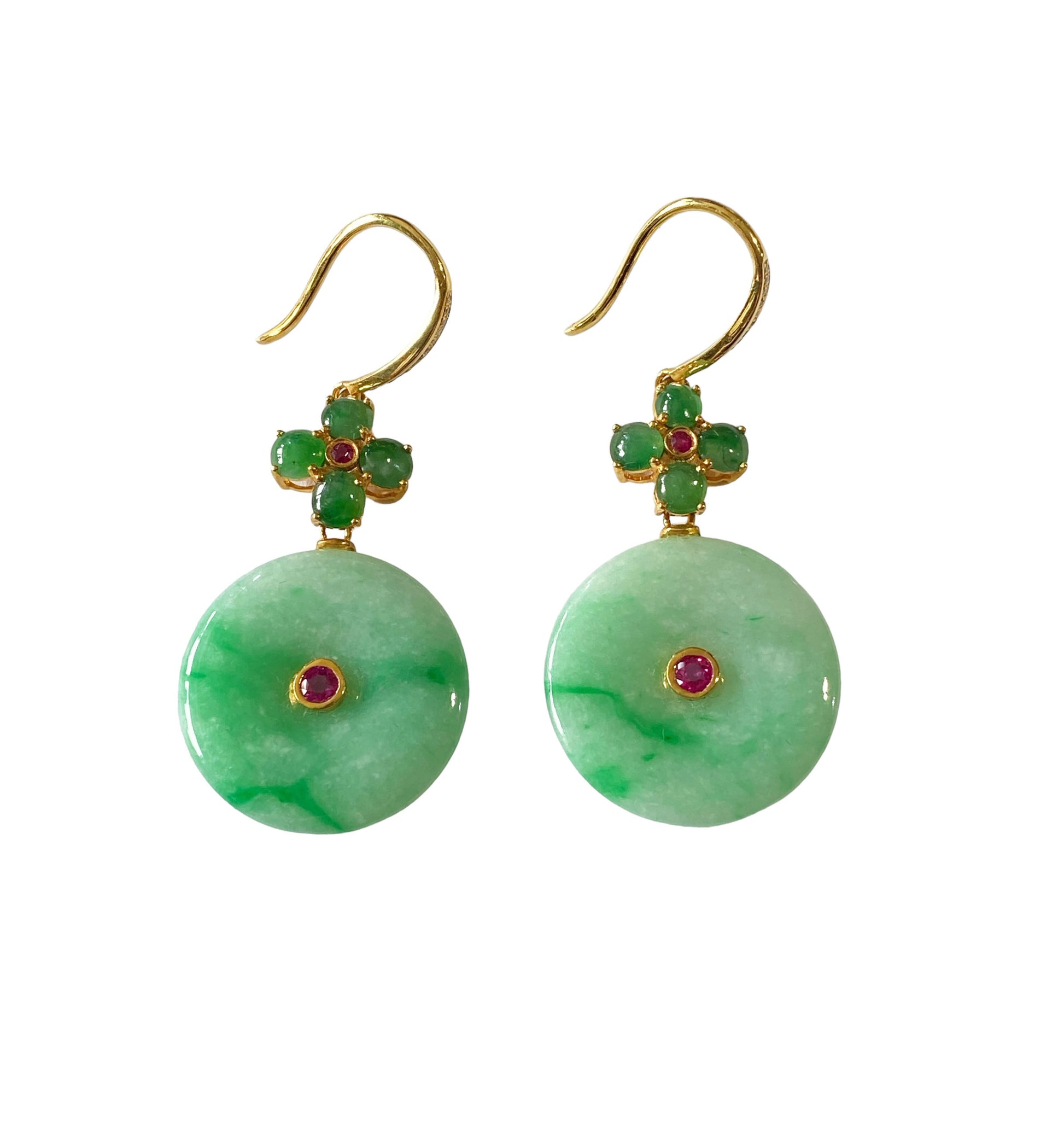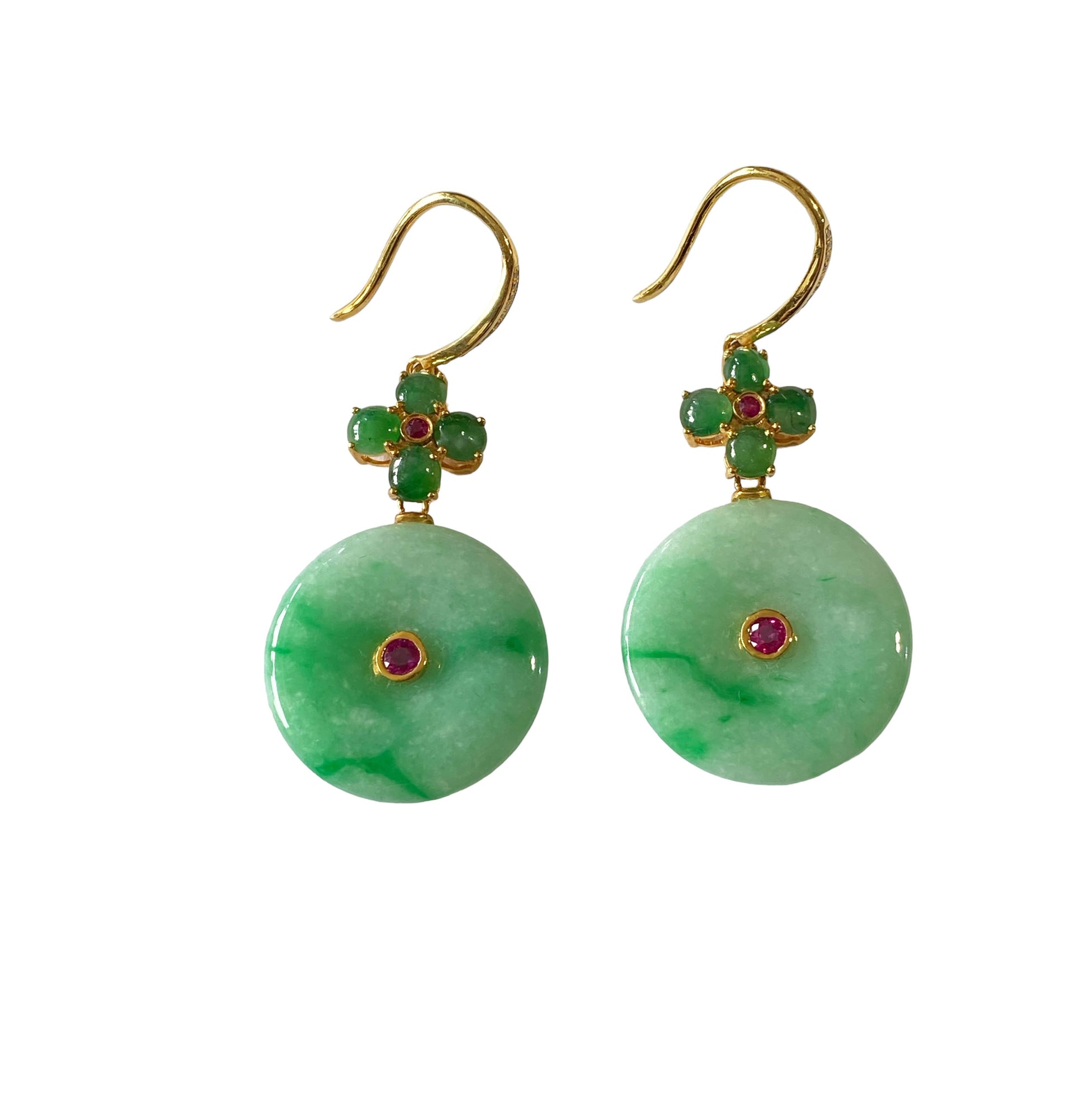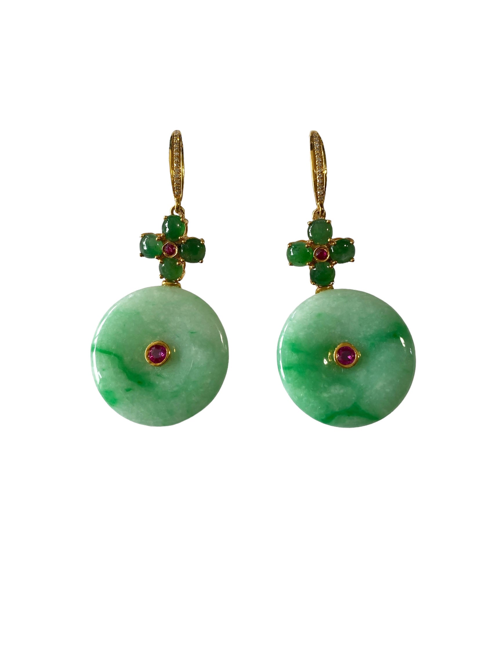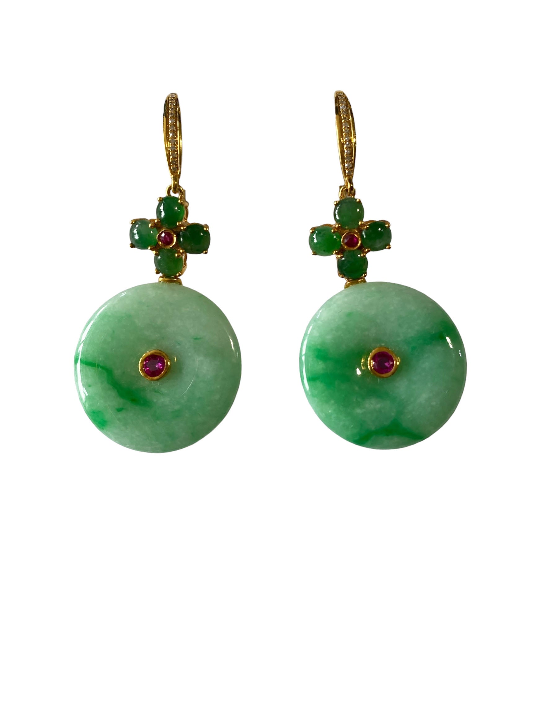 These stunning 18k gold art deco earrings showcase a large 100% round jadeite jade stone accented by centered ruby stone . Four additional round jade stones create a floral design, with a centered ruby and pave diamond on top. Measuring 2" in height and 1" in width, with a depth of 0.50", these earrings exude sophistication and elegance.