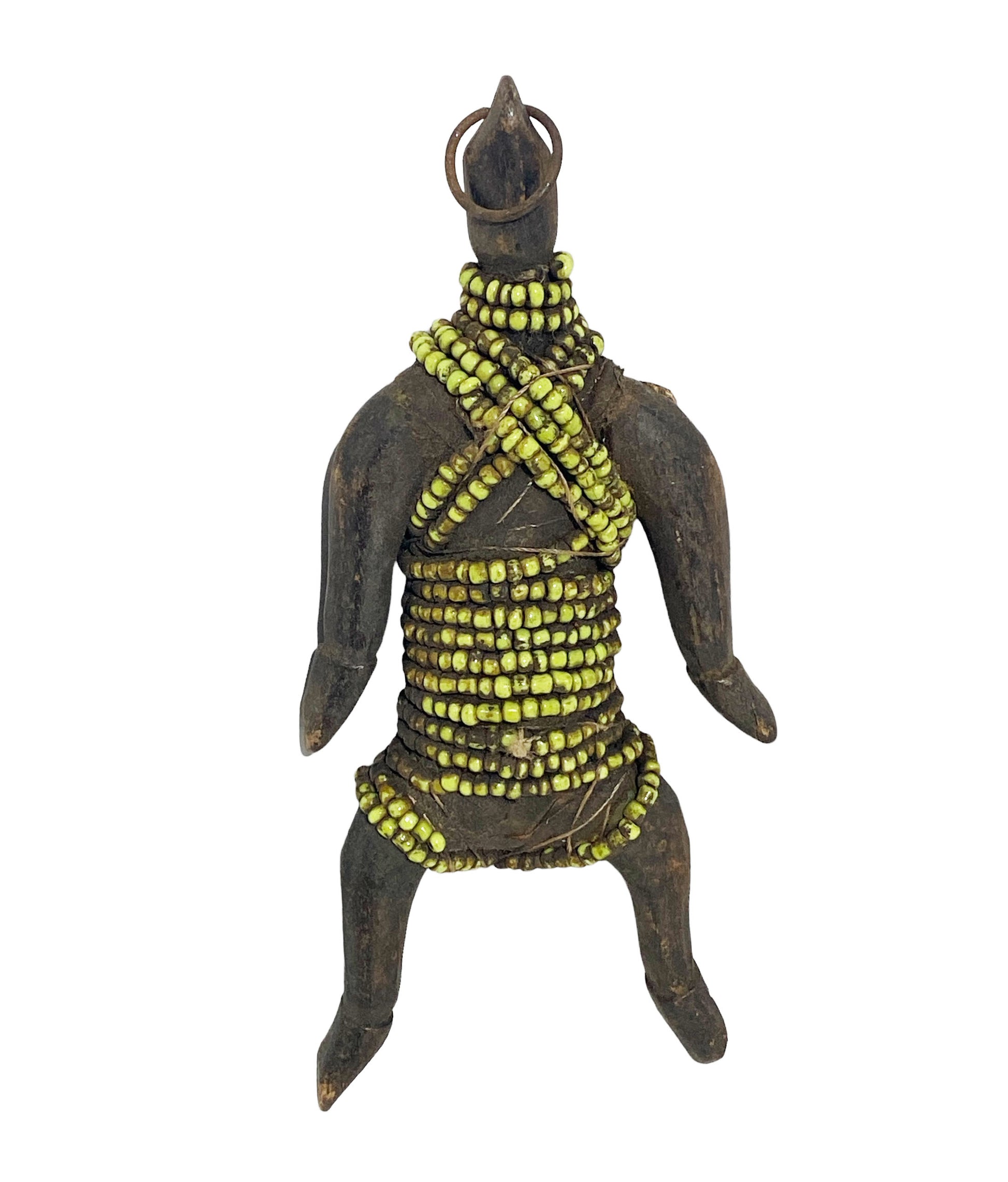 This stunning African Fali fertility doll is adorned with multiple layers of intricate glass beads and a leather amulet. Measuring 8.5" in height, 4" in width, and 1" in depth, this doll holds a special meaning in Cameroon. Traditionally, when a young Fali man becomes engaged, he creates a doll (known as a ham pilu) from wood and embellishes it with hair, beads, and other small objects. He then presents it to his future wife, who carries it in a baby carrier on her back. This doll serves as a symbolic representation of their marriage commitment and the hopes for their future child. The man also assigns the doll a gender, indicating his preference for their first-born. The young woman takes care of the doll until the promised child is born, at which point it is carefully stored away by the couple.