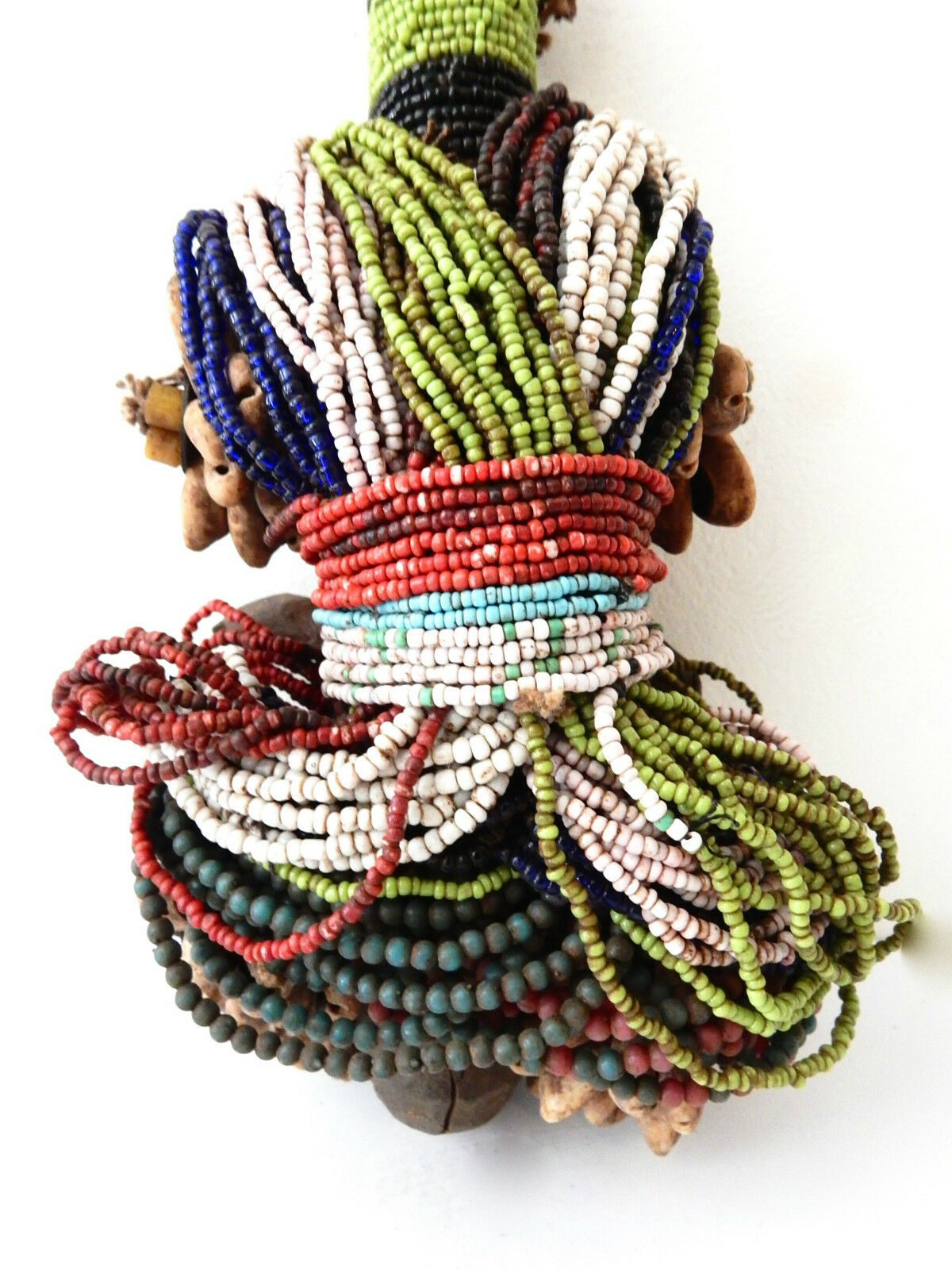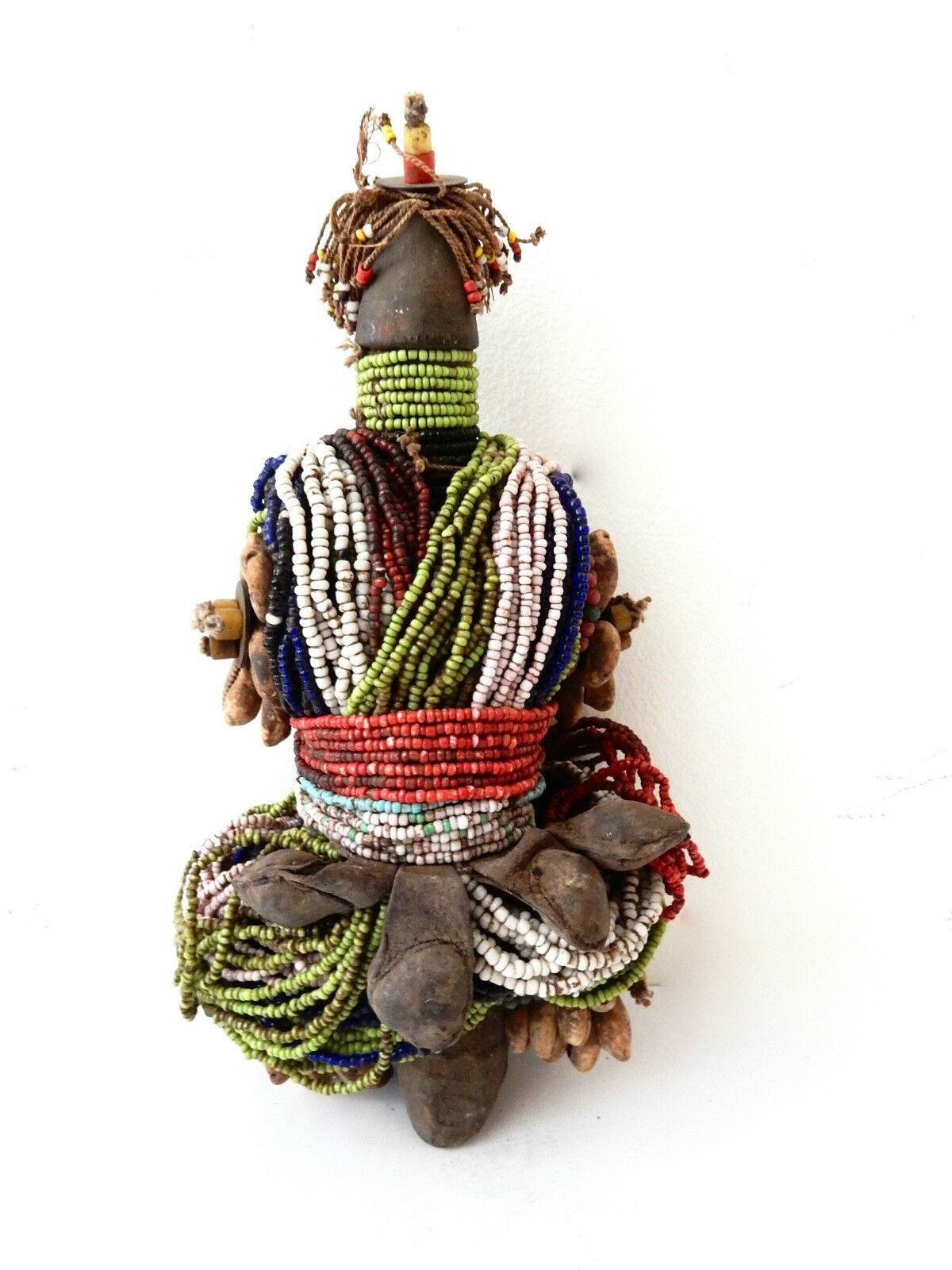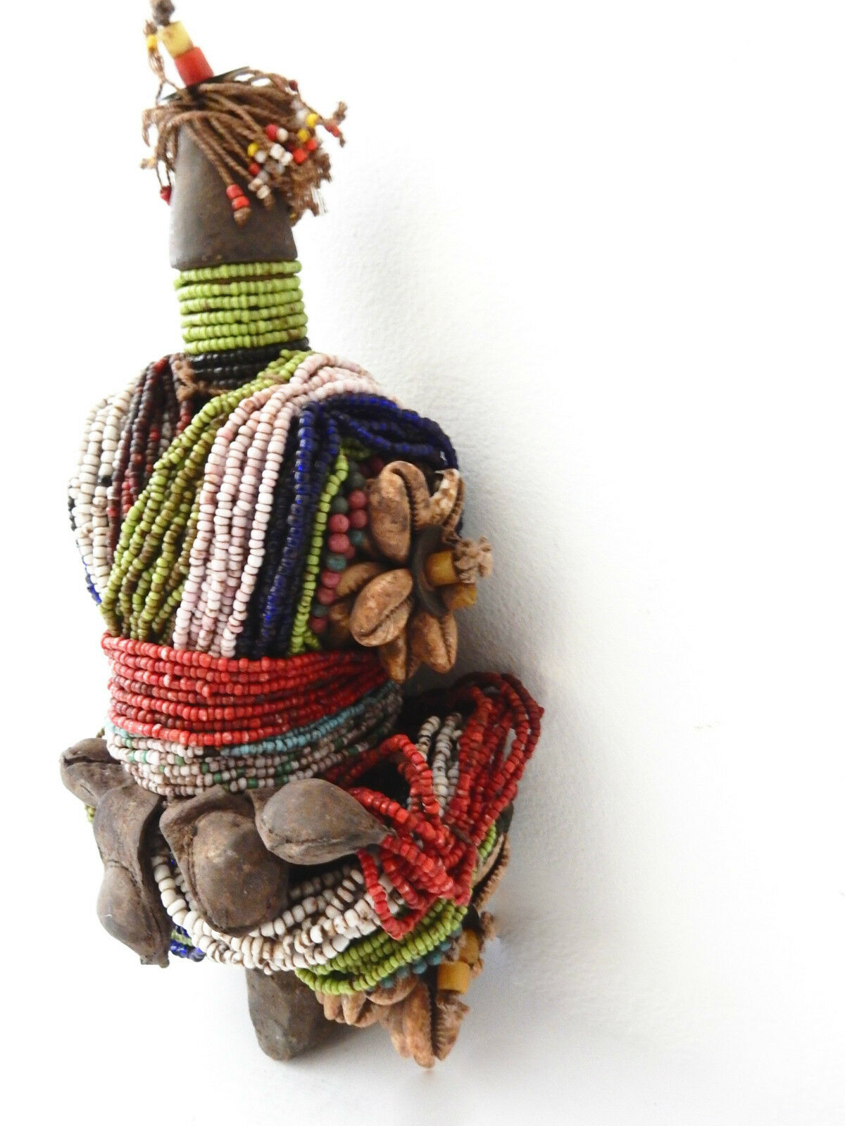 Superb African Fali fertility doll decorated with multiple layers of beads and cowrie shells, as well as leather amulets.