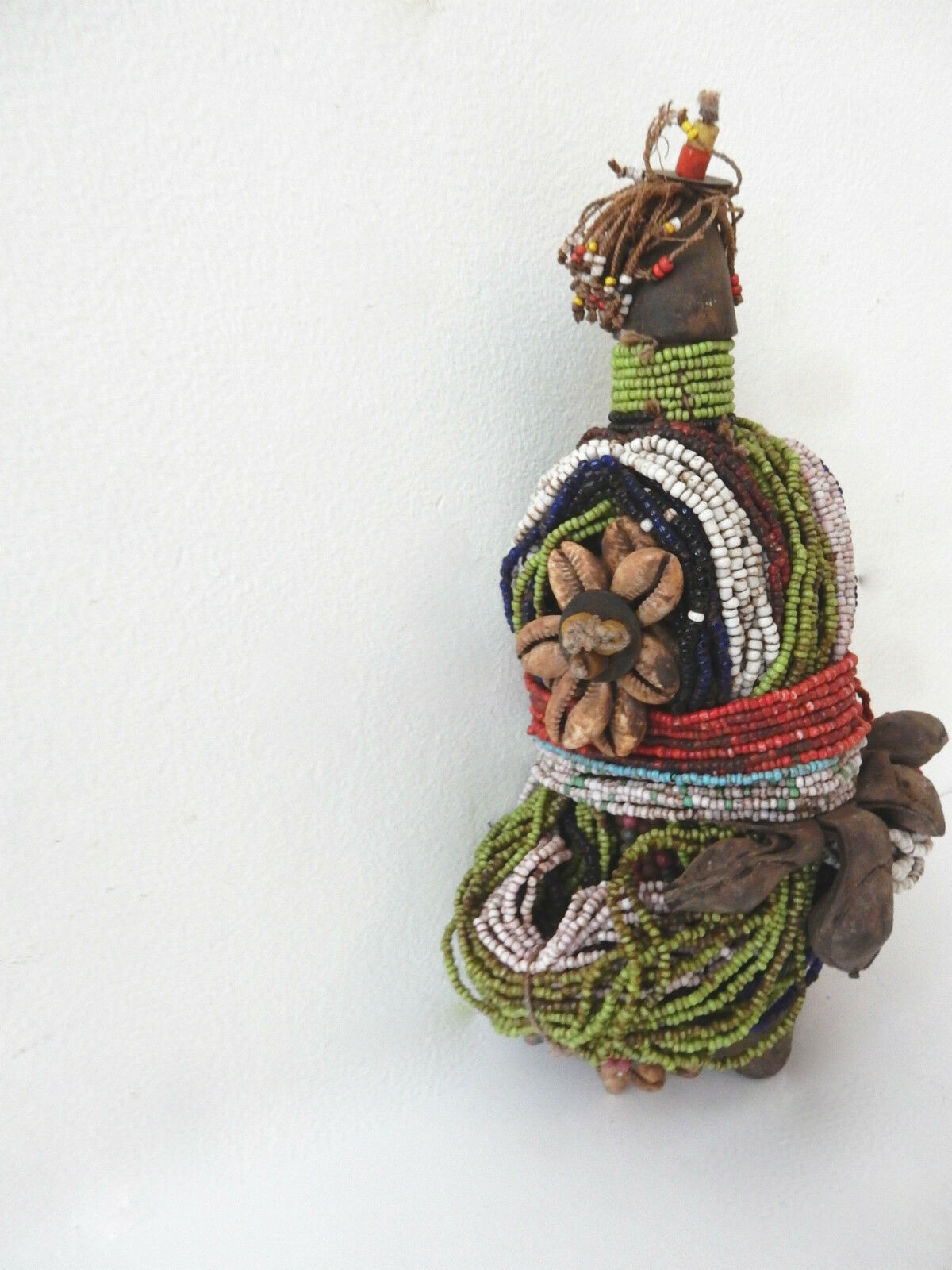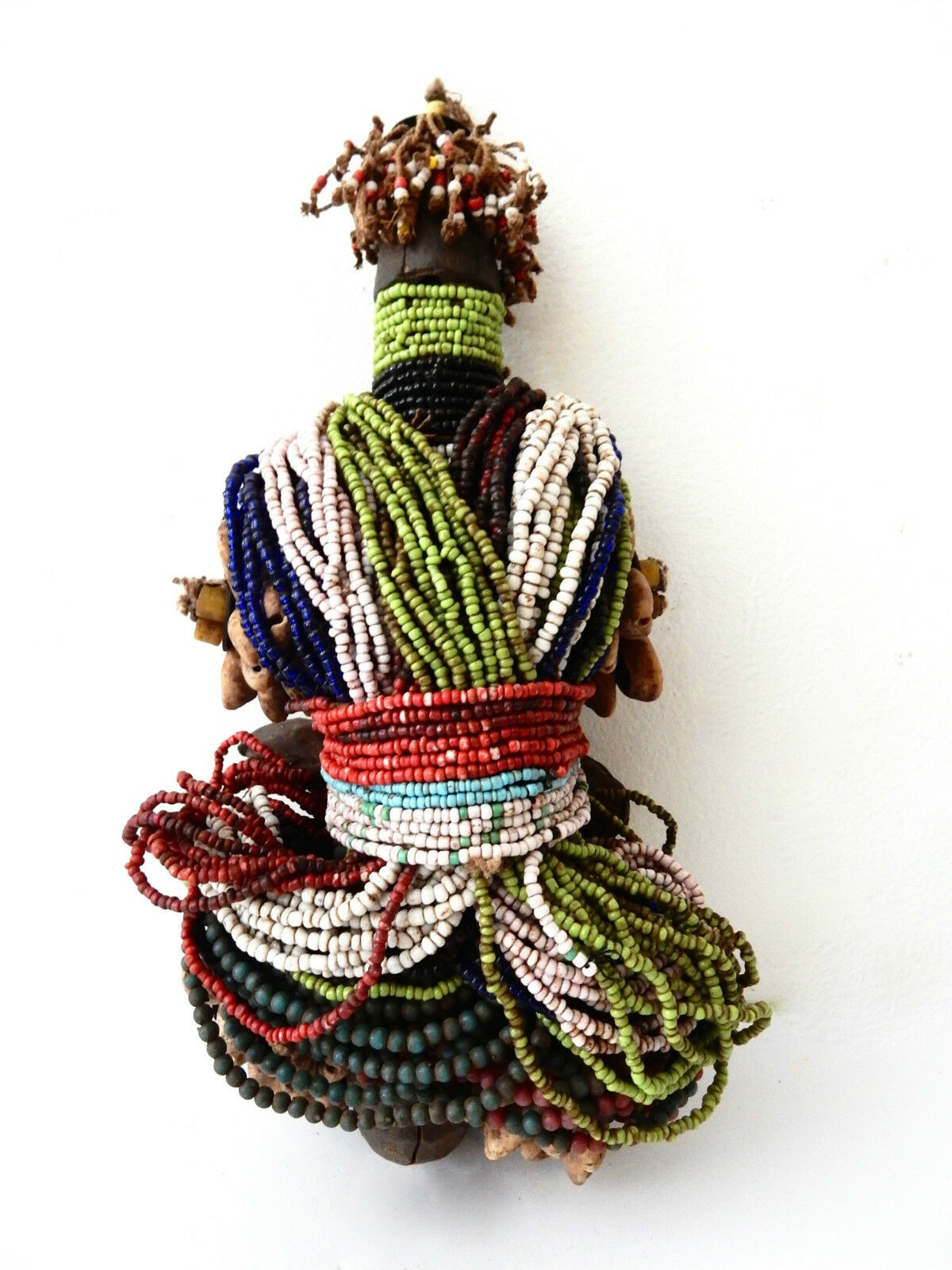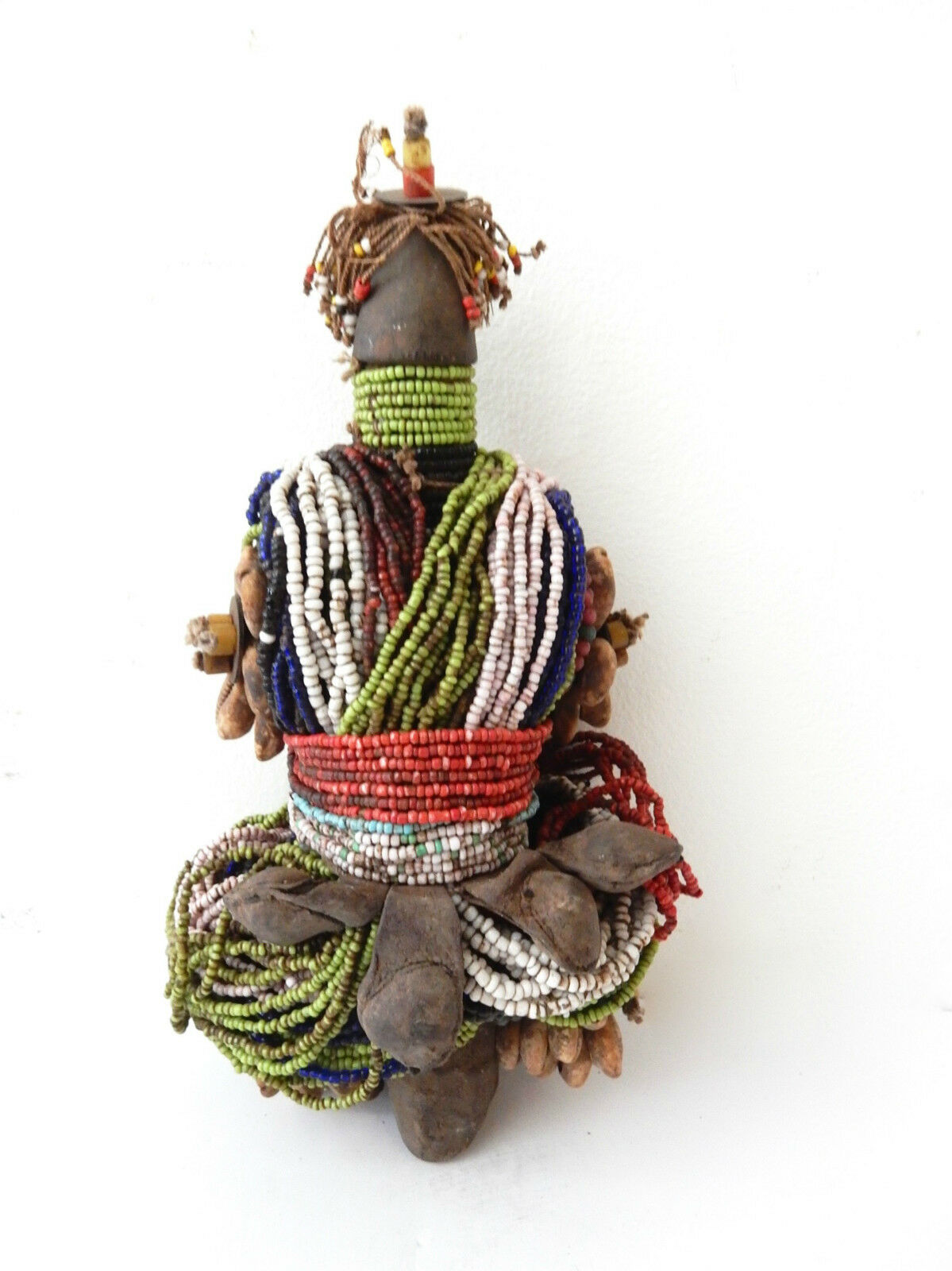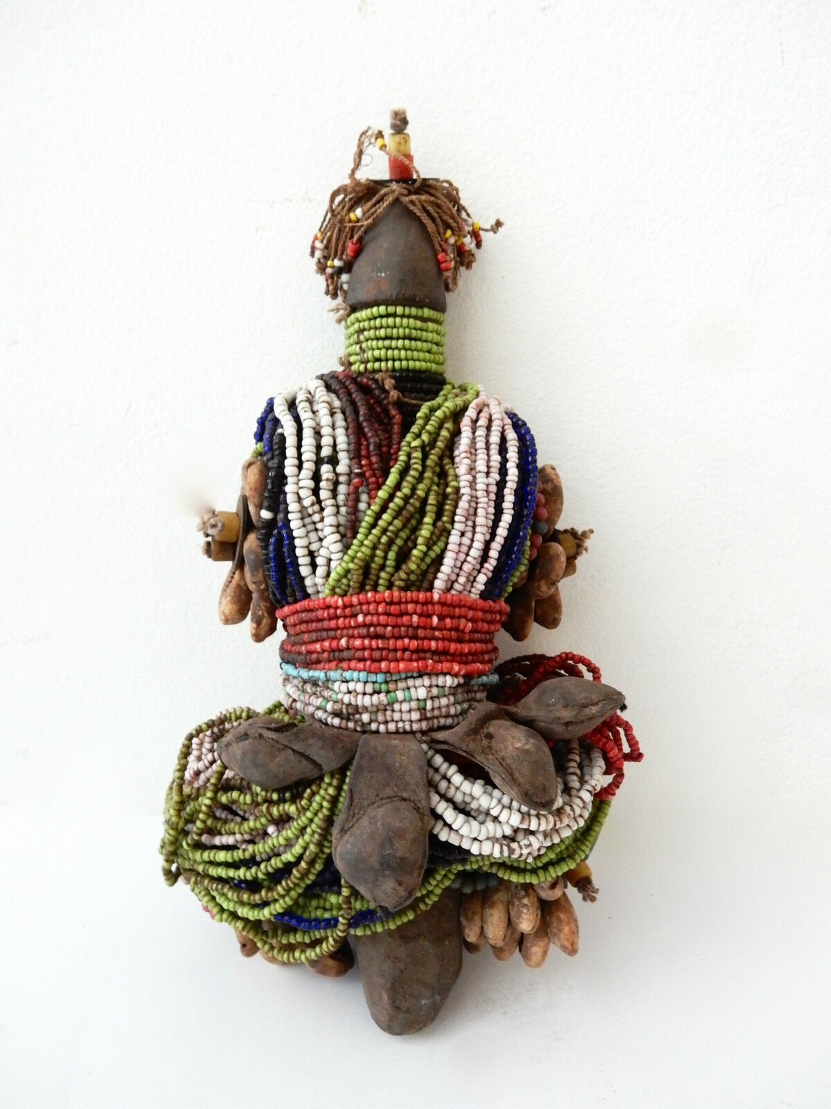 Superb African Fali fertility doll decorated with multiple layers of beads and cowrie shells, as well as leather amulets.