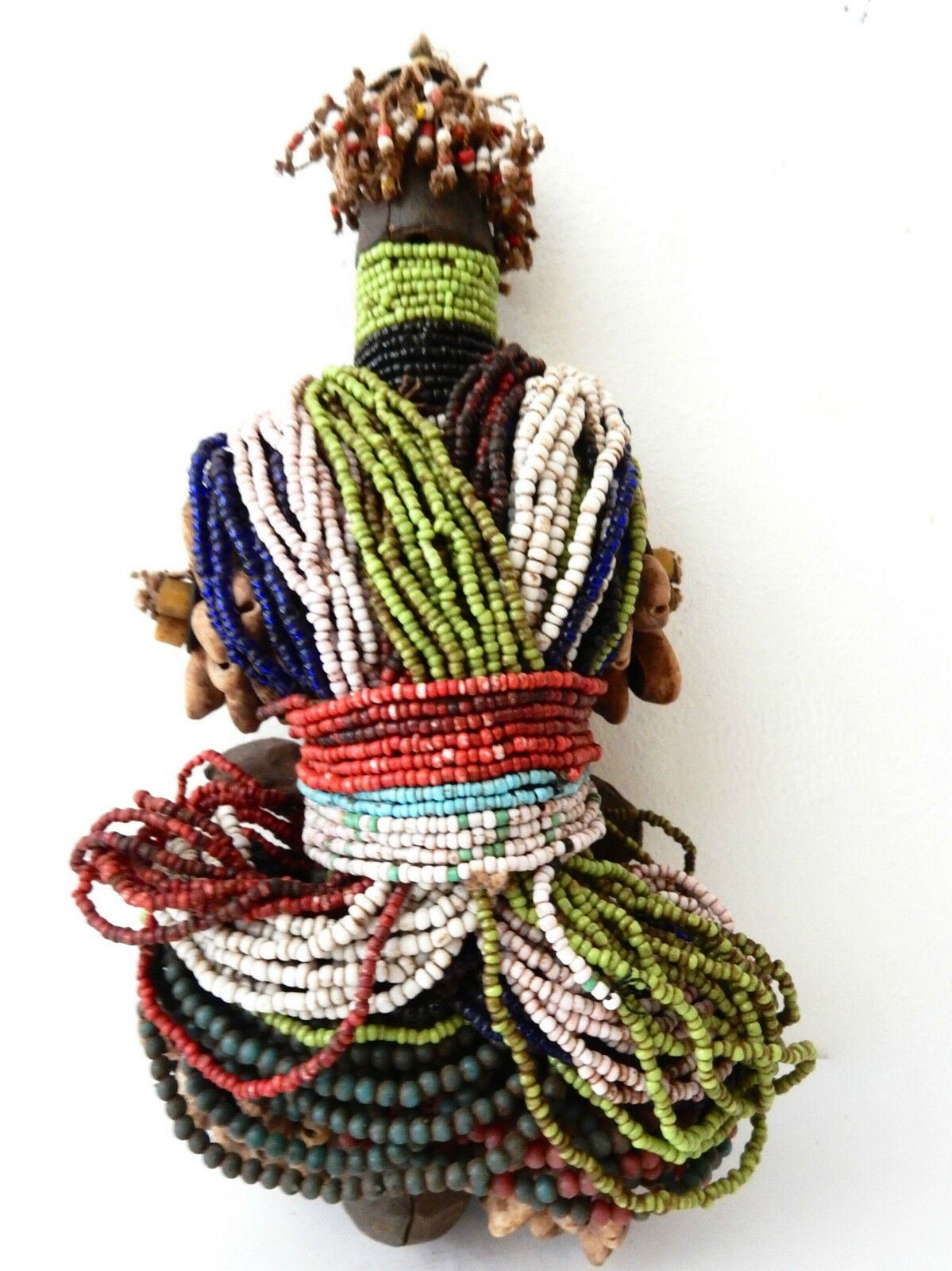 "In Cameroon, when a young Fali man becomes betrothed, he makes a doll(ham pilu) from wood and decorates it with hair, beads, and other small objects. He then gives it to his fiance, who wears it in a baby carrier on her back. The doll is a symbol of their marriage commitment and represents their future child. The man gives the doll the gender that he desires for his first-born. The young woman cares for the figure until the promised child is born; at this point, the couple carefully stores the doll away.