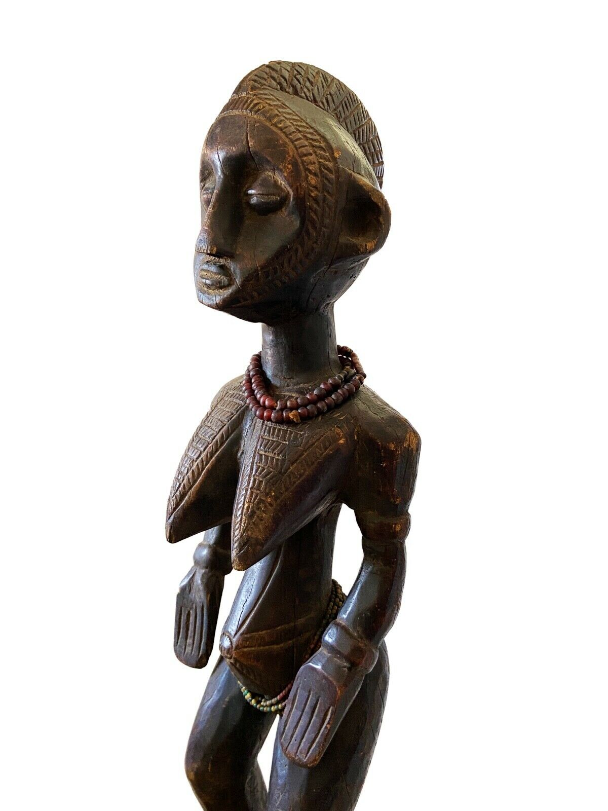 This Senufo Tyepka maternity figure, crafted by the Senufo people of West Africa, is a striking sculpture that pays tribute to the important role of women in the Tyepka society's ceremonies and festivals. Standing at 28.5" H and measuring 7.5" W by 6" D (with a stand of 9" W by 6.25" D), it is a highly coveted piece for collectors.